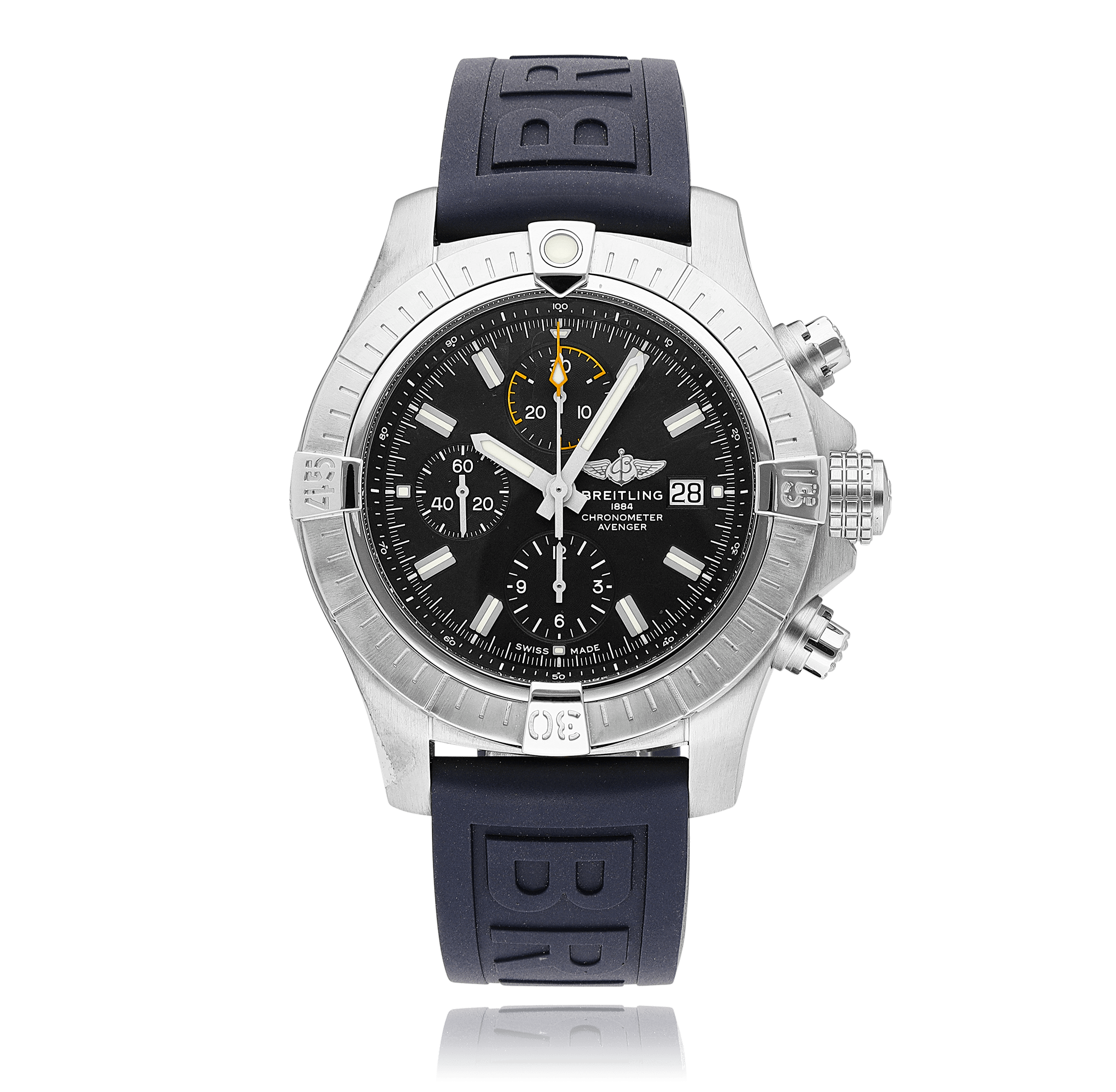 Breitling Avenger mit einem 45 mm Edelstahl Gehäuse und Saphir-Glas, Wasserdicht; im Innern befindet sich das Automat Kaliber Breitling 13, das Zifferblatt ist Schwarz Index mit Datums-Anzeige, das Band ist ein Kautschuk ; Zubehör: Verkaufs-Garantie (original), Verkaufs-Box (original).