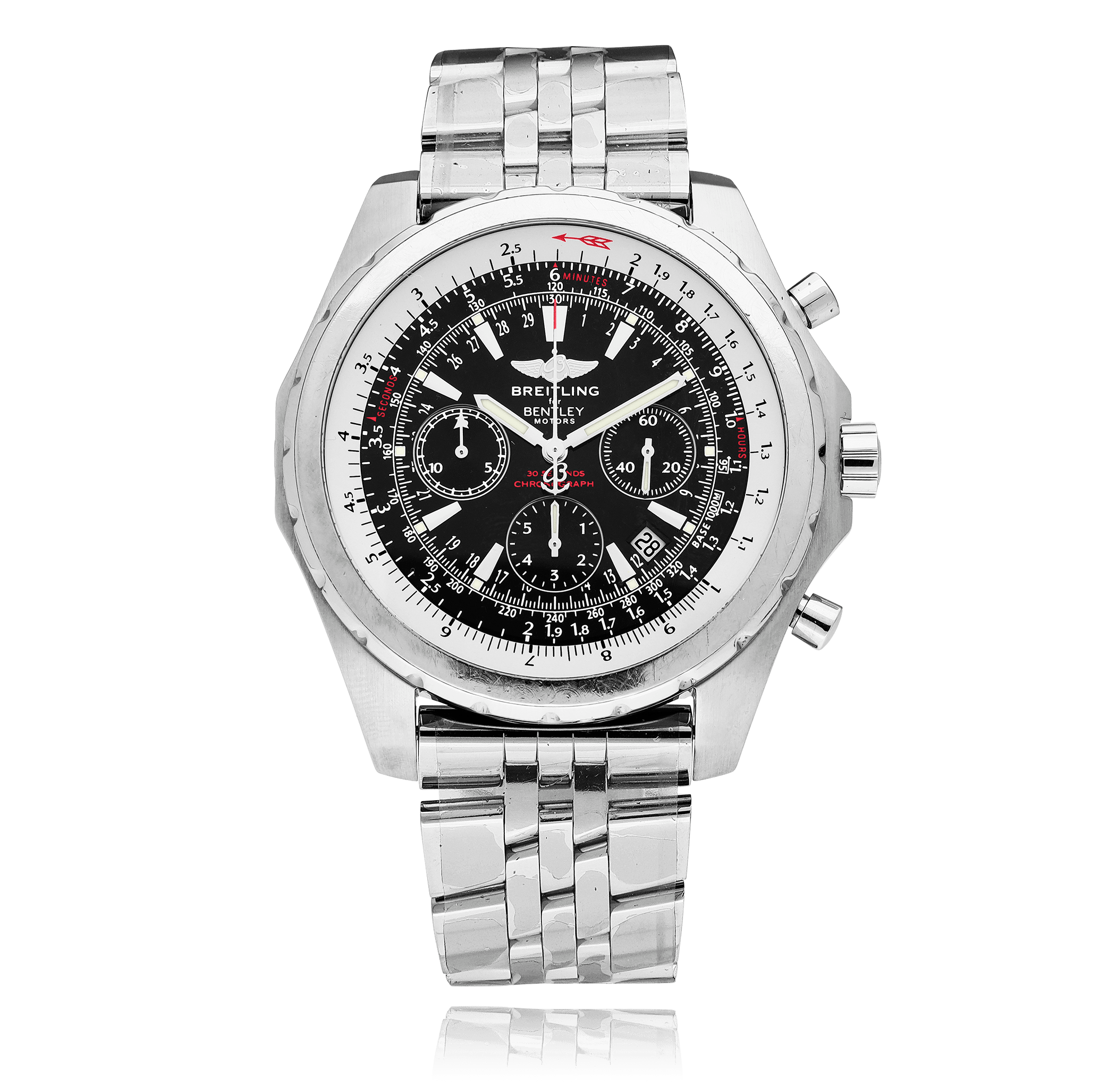 Breitling Breitling for Bentley mit einem 49 mm Edelstahl Gehäuse und Saphir-Glas, Wasserdicht; im Innern befindet sich das Automat Kaliber , mit Zusatzfunktion Chronograph das Zifferblatt ist Schwarz Index mit Datums-Anzeige, das Band ist ein Stahl Metallband; Zubehör: Bucherer-Box.