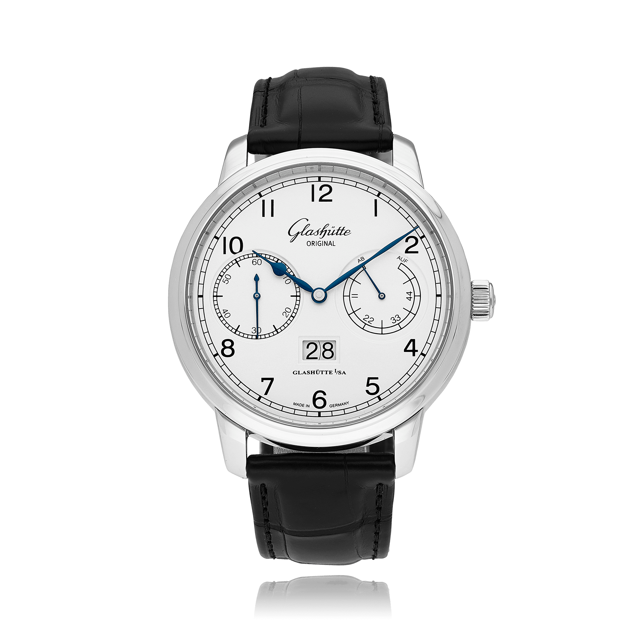 Glashütte Original Senator mit einem 44 mm Edelstahl Gehäuse und Saphir-Glas, Wasserdicht; im Innern befindet sich das Automat Kaliber 100-14, das Zifferblatt ist Silber Arabisch / Index Grosses Datums-Anzeige, das Band ist ein Alligator Lederarmband; Zubehör: Verkaufs-Garantie (original), Verkaufs-Box (original).