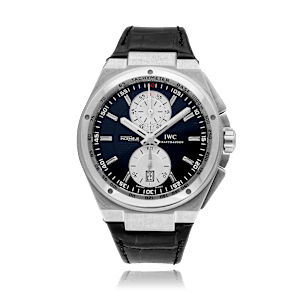 IWC Schaffhausen Ingenieur mit einem 46 mm Edelstahl Gehäuse und Saphir-Glas, Wasserdicht; im Innern befindet sich das Automat Kaliber 89360, das Zifferblatt ist Schwarz Index mit Datums-Anzeige, das Band ist ein Alligator Lederarmband; Zubehör: Verkaufs-Garantie (original), Verkaufs-Box (original).