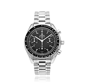 Omega Speedmaster mit einem 39 mm Edelstahl Gehäuse und Acryl-Glas, Wasserdicht; im Innern befindet sich das Automat Kaliber 3220, das Zifferblatt ist Schwarz Index ohne Datums-Anzeige, das Band ist ein Stahl Metallband; Zubehör: Bucherer-Box.