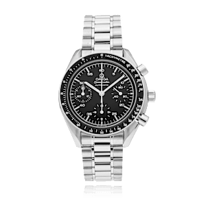 Omega Speedmaster mit einem 39 mm Edelstahl Gehäuse und Acryl-Glas, Wasserdicht; im Innern befindet sich das Automat Kaliber 3220, das Zifferblatt ist Schwarz Index ohne Datums-Anzeige, das Band ist ein Stahl Metallband; Zubehör: Bucherer-Box.