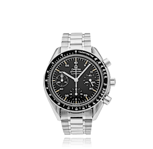 Omega Speedmaster mit einem 39 mm Edelstahl Gehäuse und Acryl-Glas, Wasserdicht; im Innern befindet sich das Automat Kaliber 3220, das Zifferblatt ist Schwarz Index ohne Datums-Anzeige, das Band ist ein Stahl Metallband; Zubehör: Bucherer-Box.