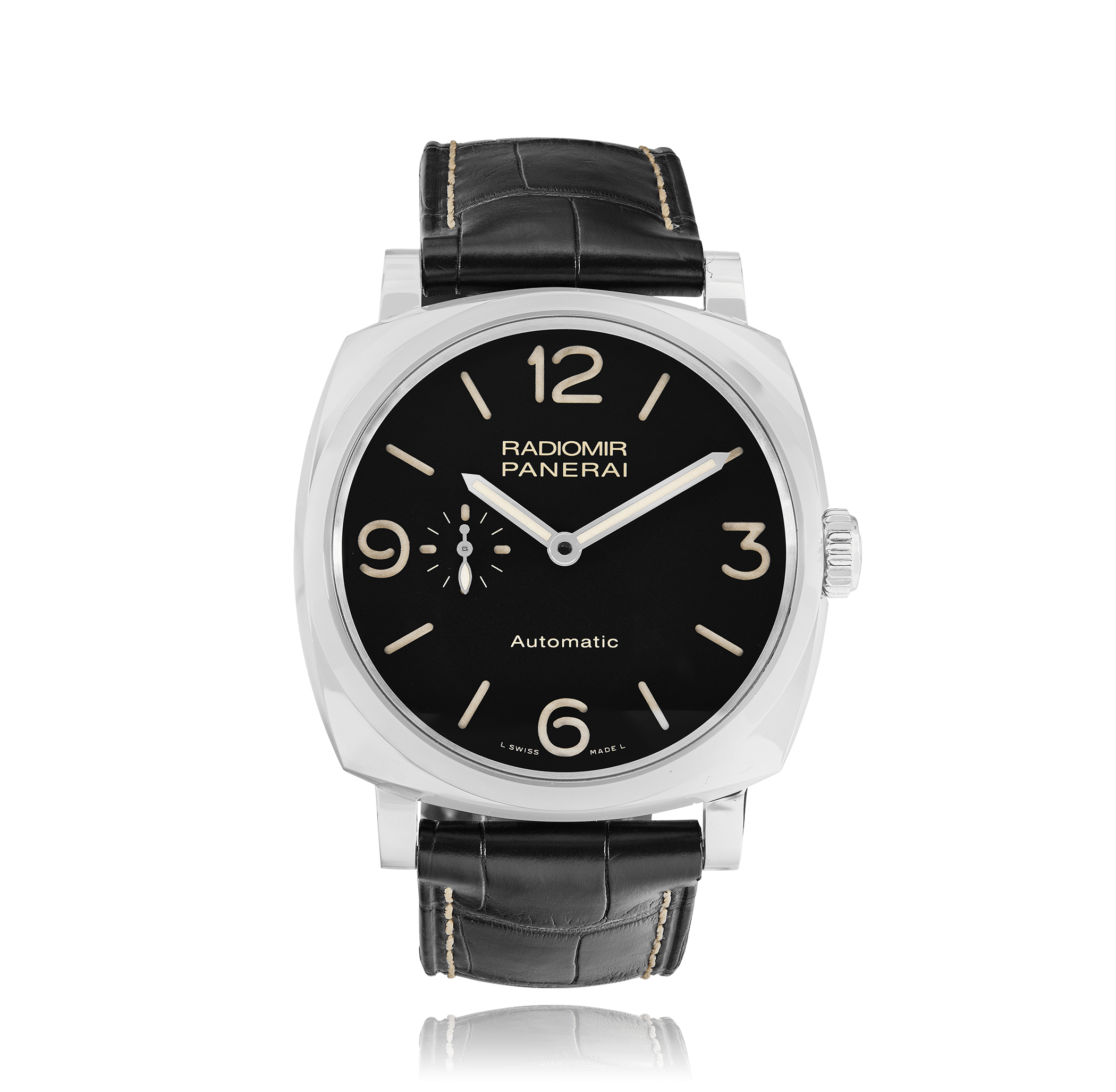 Panerai Radiomir 1940 mit einem 45 mm Edelstahl Gehäuse und Saphir-Glas, Wasserdicht; im Innern befindet sich das Automat Kaliber P.4000, mit Zusatzfunktion kleine Sekundenanzeige das Zifferblatt ist Schwarz Arabisch / Index ohne Datums-Anzeige, das Band ist ein Alligator Lederarmband; Zubehör: Verkaufs-Box (original), Verkaufs-Garantie (original).