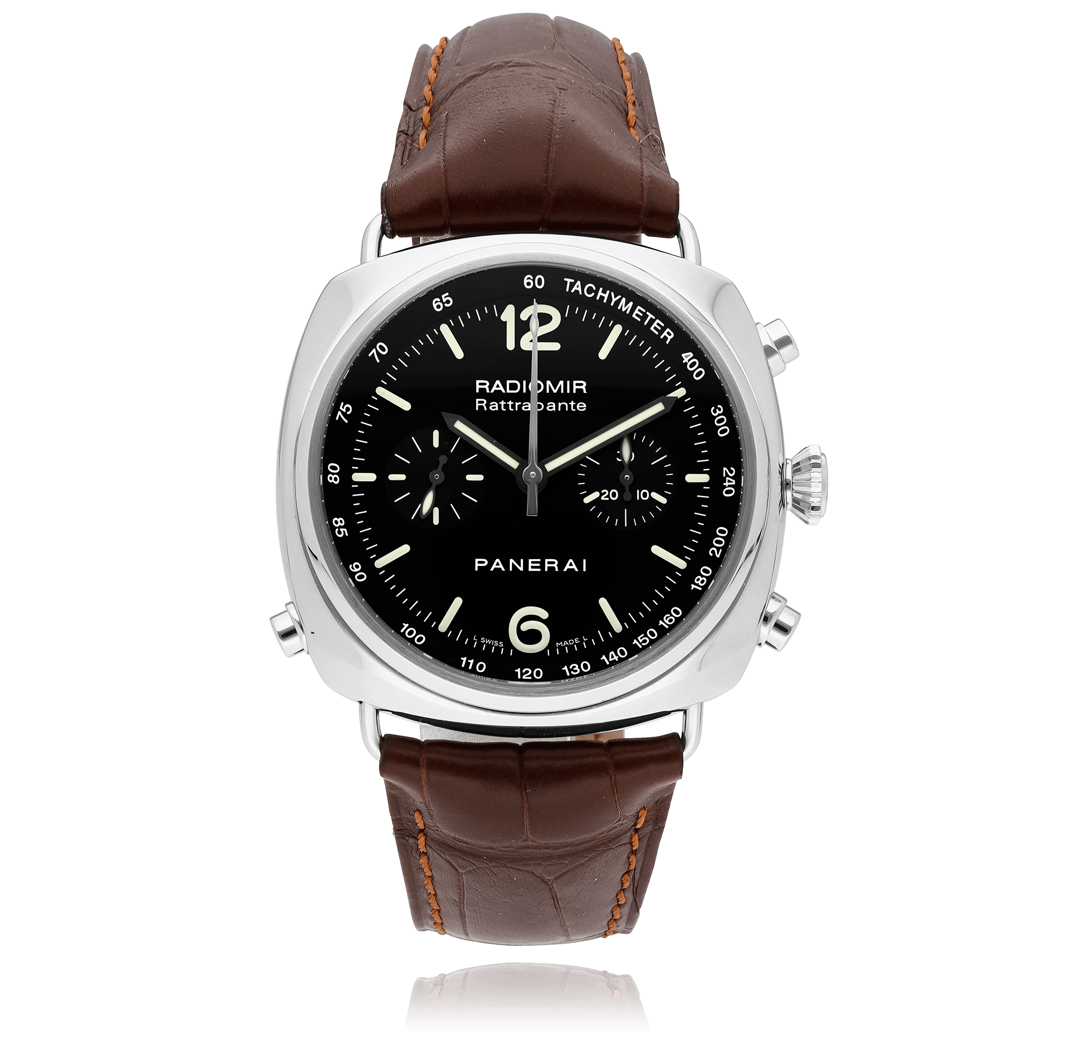 Panerai RADIOMIR mit einem 45 mm Edelstahl Gehäuse und Saphir-Glas, Wasserdicht; im Innern befindet sich das Automat Kaliber OP XVIII, mit Zusatzfunktion Chronograph das Zifferblatt ist Schwarz Arabisch / Index ohne Datums-Anzeige, das Band ist ein Leder Lederarmband; Zubehör: Verkaufs-Garantie (original), Verkaufs-Box (original).