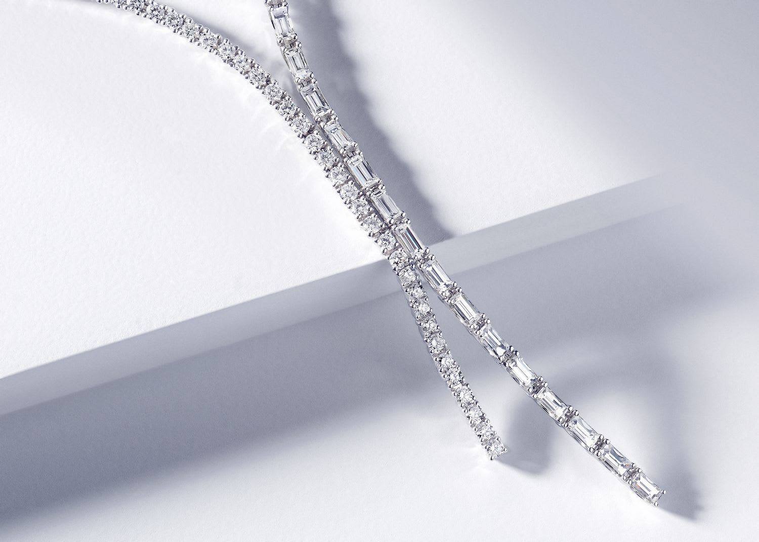 Ob im perfekten Zusammenspiel in der architektonisch inspirierten Variato Kollektion oder in gekonnter Gegenüberstellung beider Schliffe im Collier Soirée – kontrastreiche Settings setzen den Baguette-Schliff Diamant bei Bucherer Fine Jewellery modern in Szene.