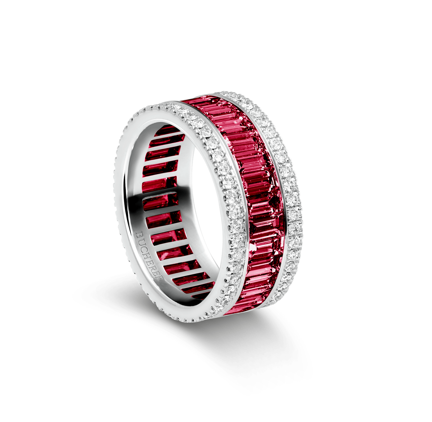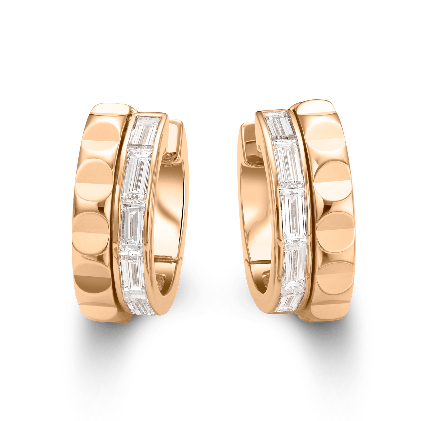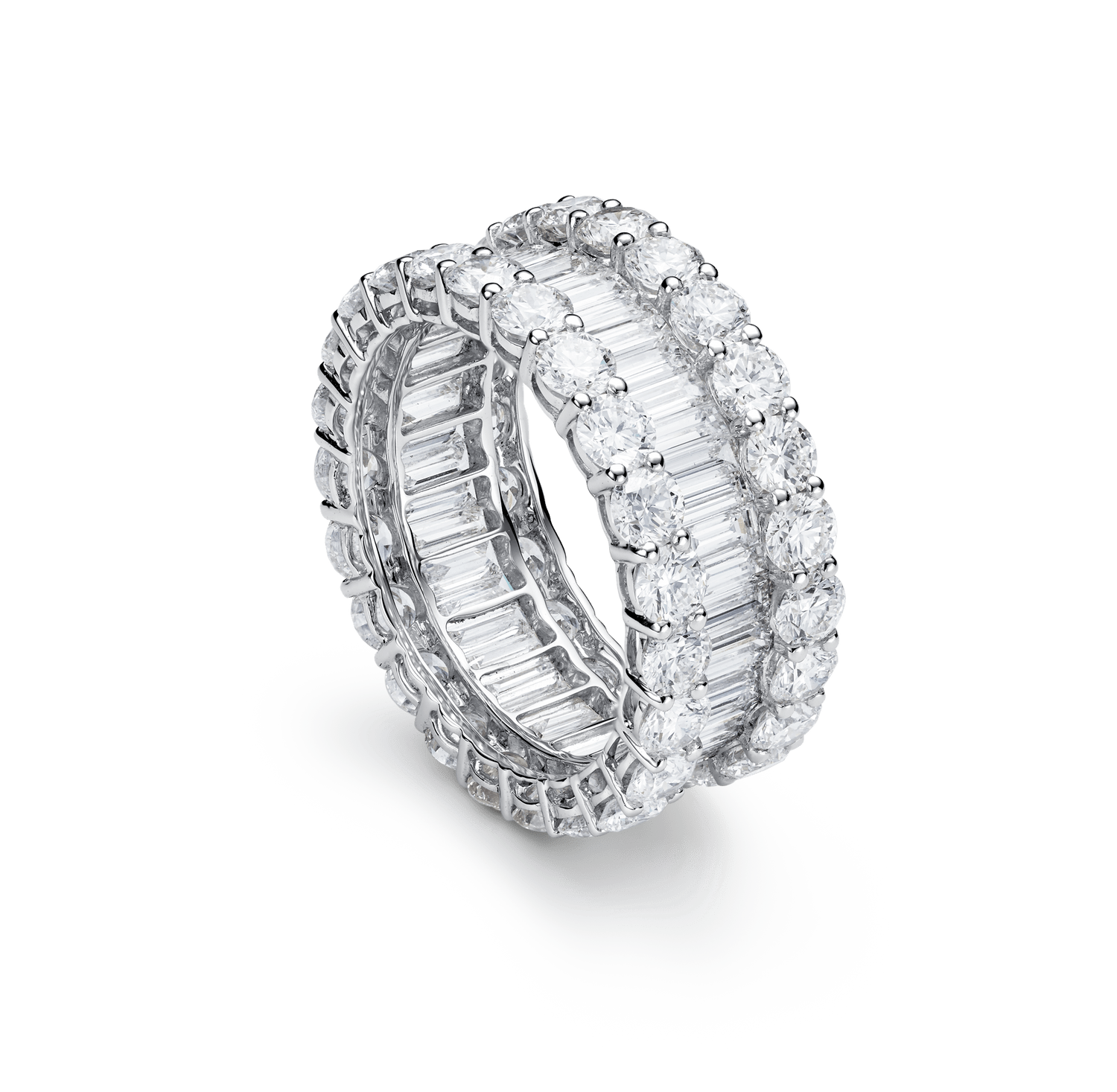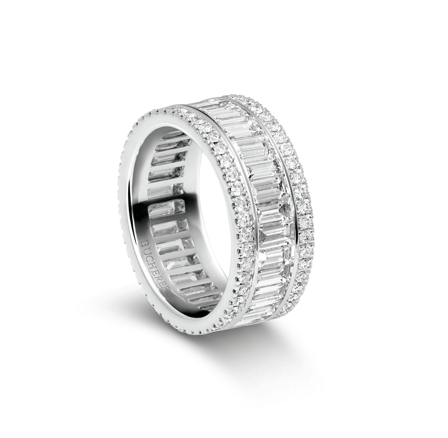 Da Baguette-Schliff Diamanten oft als Paar oder gleich als Serie verarbeitet werden ist es wichtig, dass sie einheitliche Farben, Reinheit und Proportionen aufweisen. Abweichungen, vor allem in der Schliffgüte und Farbe sind oft schon von blossem Auge sichtbar und stören die Eleganz und die perfekte Optik. Bei diesen Ringen von Bucherer Fine Jewellery entstehen elegante Schmuckhighlights durch die kunstvolle Kombination von Baguette- und Brillant-Schliff Diamanten.