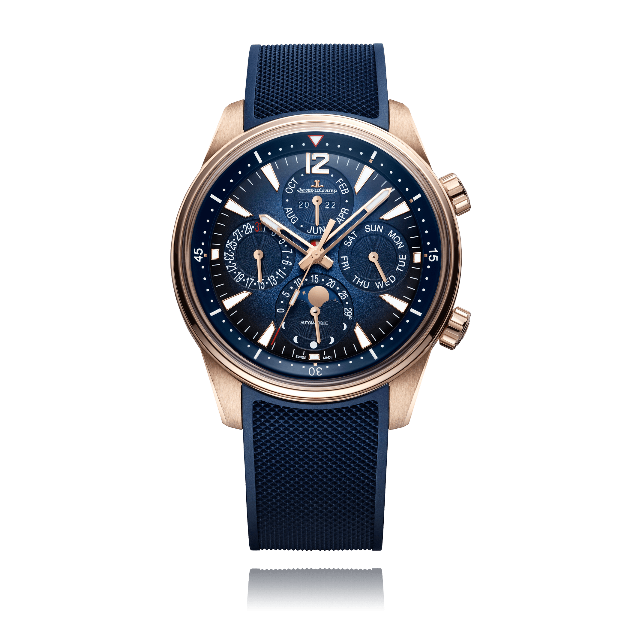 JAEGER-LE COULTRE Armbanduhr, Polaris 42 mm, Rotgold, Alligatorlederband, mit Falt-Schliesse Zifferblatt: blau arab./Index, Interchangeable rubber strap Automat, Kaliber 868AA, Zentrum-Sekunde, Saphir-Glas, 10 Atm, ewiger Kalender, Ref.:9082680