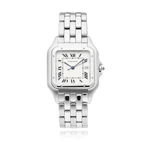 Cartier Panthere de Cartier with a 29 mm stainless steel case and a sapphire glass, water resistant; inside is the quartz calibre h2, a silver roman face with date indication, the bracelet is a steel metal bracelet; accessory: bucherer box.