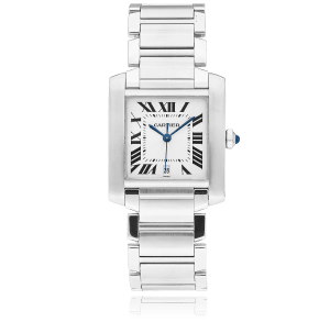Cartier Tank with a 28 mm stainless steel case and a sapphire glass, water resistant; inside is the automatic calibre , a silver roman face with date indication, the bracelet is a steel metal bracelet; accessory: sales guarantee (original), sales box (original).