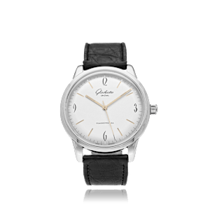 Glashütte Original Sixties with a 38 mm stainless steel case and a sapphire glass, water resistant; inside is the automatic calibre , a silver arabic / index face without date indication, the bracelet is a leather leather; accessory: sales guarantee (original), sales box (original).