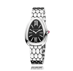 BVLGARI wristwatch, Serpenti 33 mm, steel, steel bracelet, with folding clasp, black dial with röm./Index, quartz, sapphire-crystal, 3 atm, mit pinkfarbenem Rubellit auf der Krone Ref.:103451