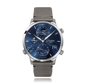 Wristwatch, GLASHÜTTE Senator Cosmopolite, 44 mm, steel,. synthetic ribbon, with folding clasp, blue dial with index, automatic, Cal. 89-02, small second indication, sapphire-crystal, 5 atm, with 2 times, Ref.:1-89-02-05-02-36