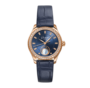 GLASHÜTTE wristwatch, Serenade Luna, 32 mm, red gold,. alligator leather strap, with double folding clasp, blue dial with index / diamonds, automatic, Cal. 39-22, sapphire-crystal, with with moon-phase indicator, brilliants, mit Brillianten Ref.:1-35-14-06-15-04