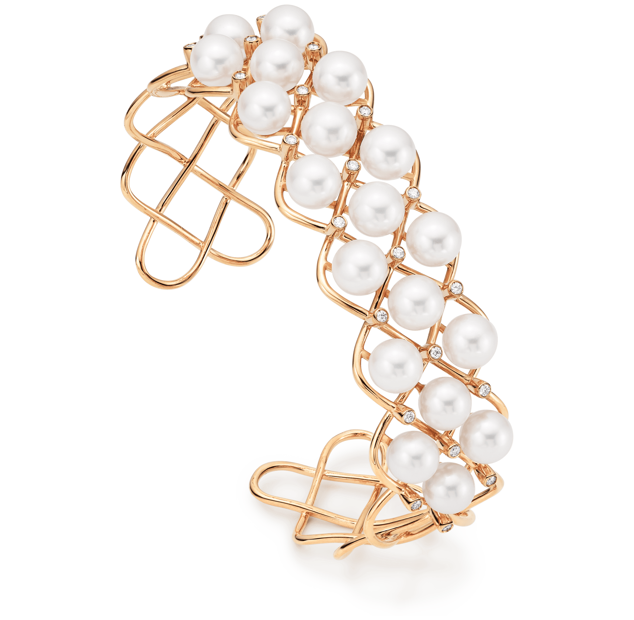 Bracelet Mesh Collection 18K rose gold, 19 cultured pearls Akoya 6 mm - 6.5 mm, 22 diamonds with brilliant cut total 0.2 ct.