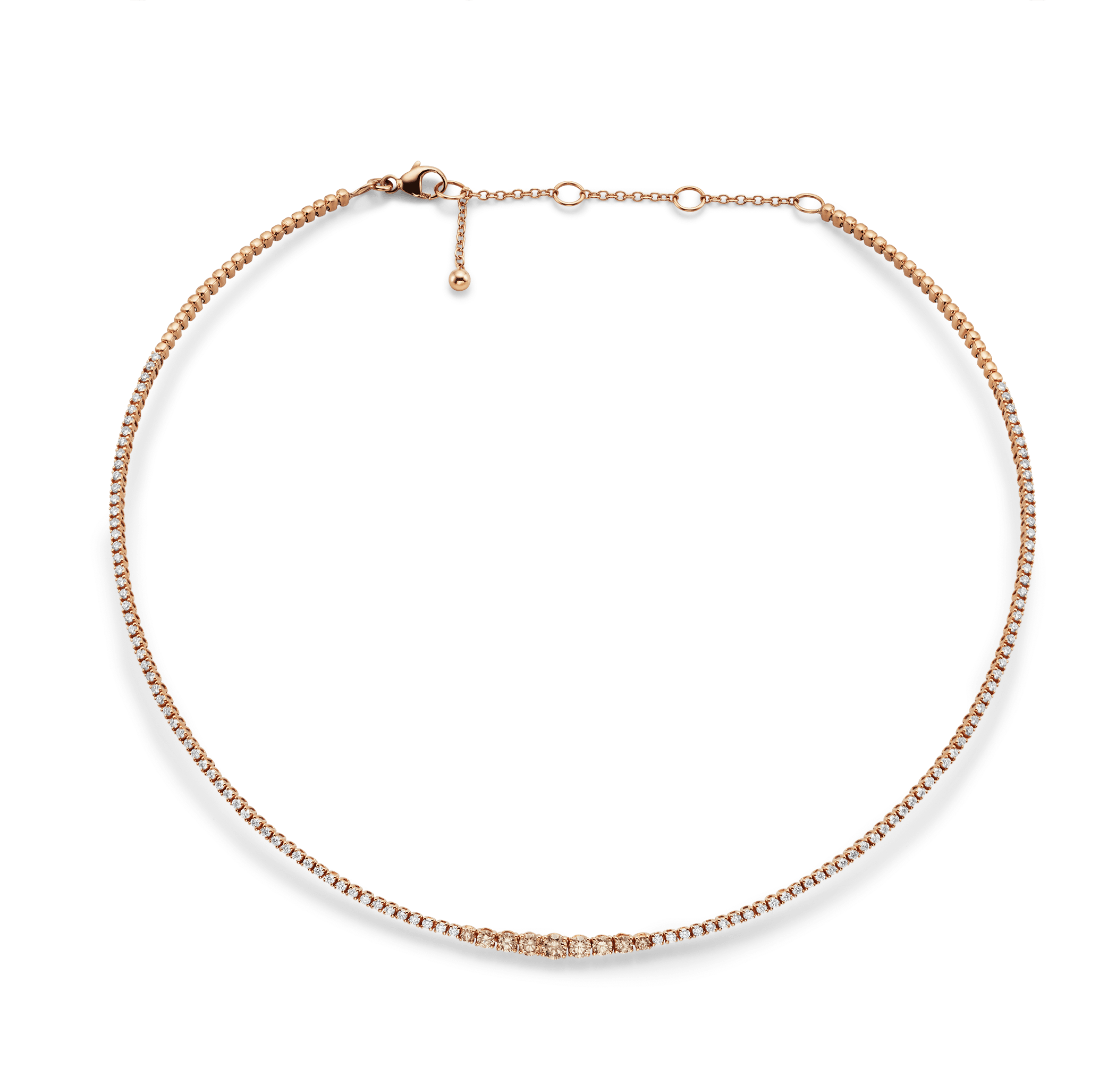 Necklace Champaign Diamonds Rivière 18K rose gold length 45 cm, 9 diamonds with brilliant cut total 0.65 ct. fancy brown diamond with brilliant cut total 1.29 ct.