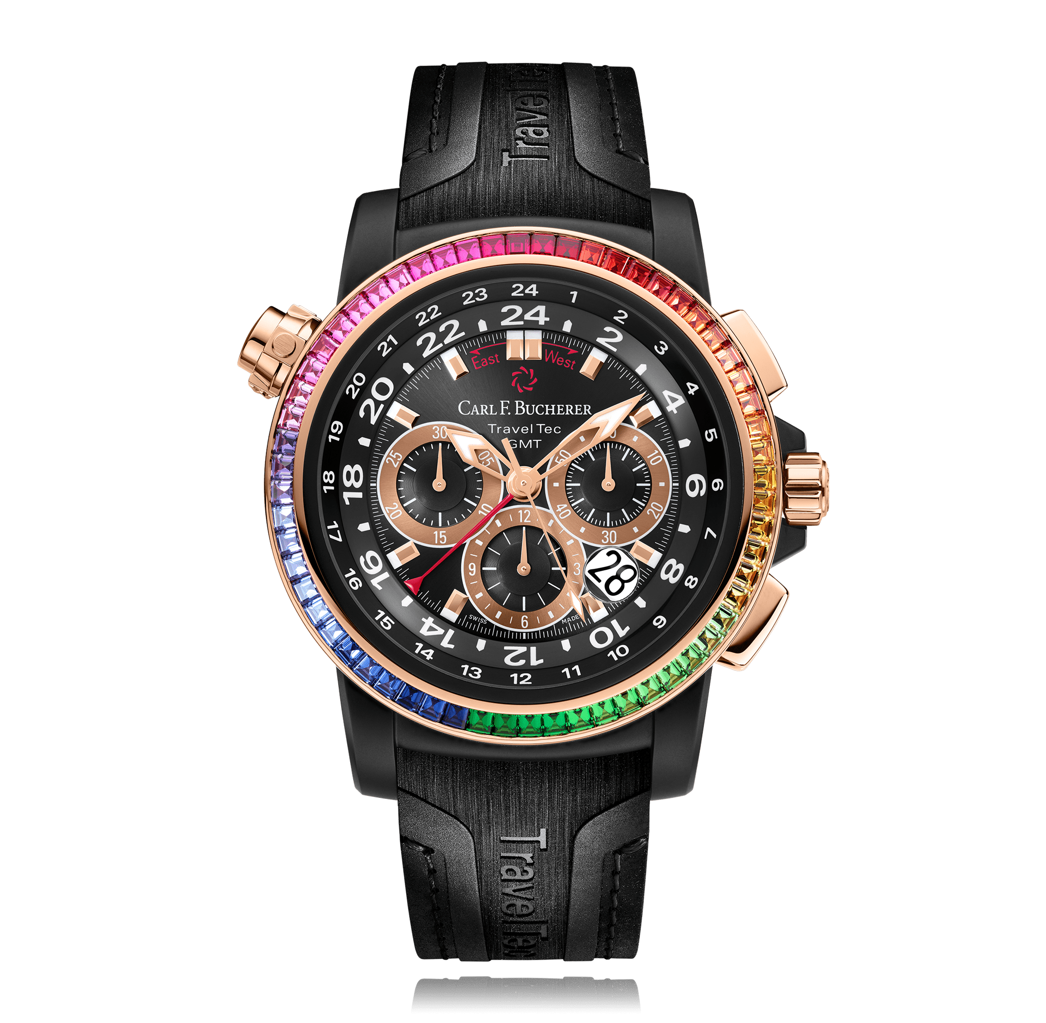 CARL F. BUCHERER Patravi TravelTec Black GMT 46.6 mm chronograph, Stahl DLC black/rose automatic with date round 5 atm/screw-down crown dial: black index, rubber strap with folding clasp, 60 precios stones baguette cut total 4.6 ct (Special Edition PARADISE) Ref.:00.10620.12.33.99