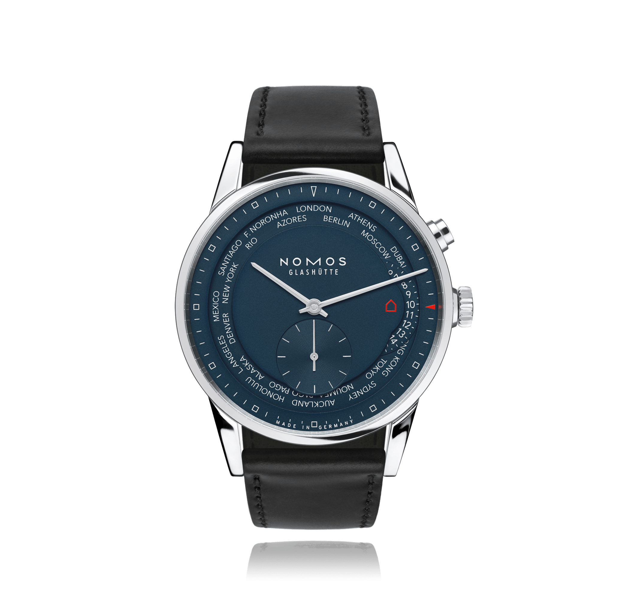 Wristwatch NOMOS Glashütte Zürich Weltzeit, 39.7mm, steel, leather strap, blue dial automatic Cal. Epsilon, sapphire-crystal, water-resistant, with World time, Ref.:807ZÜRICH
