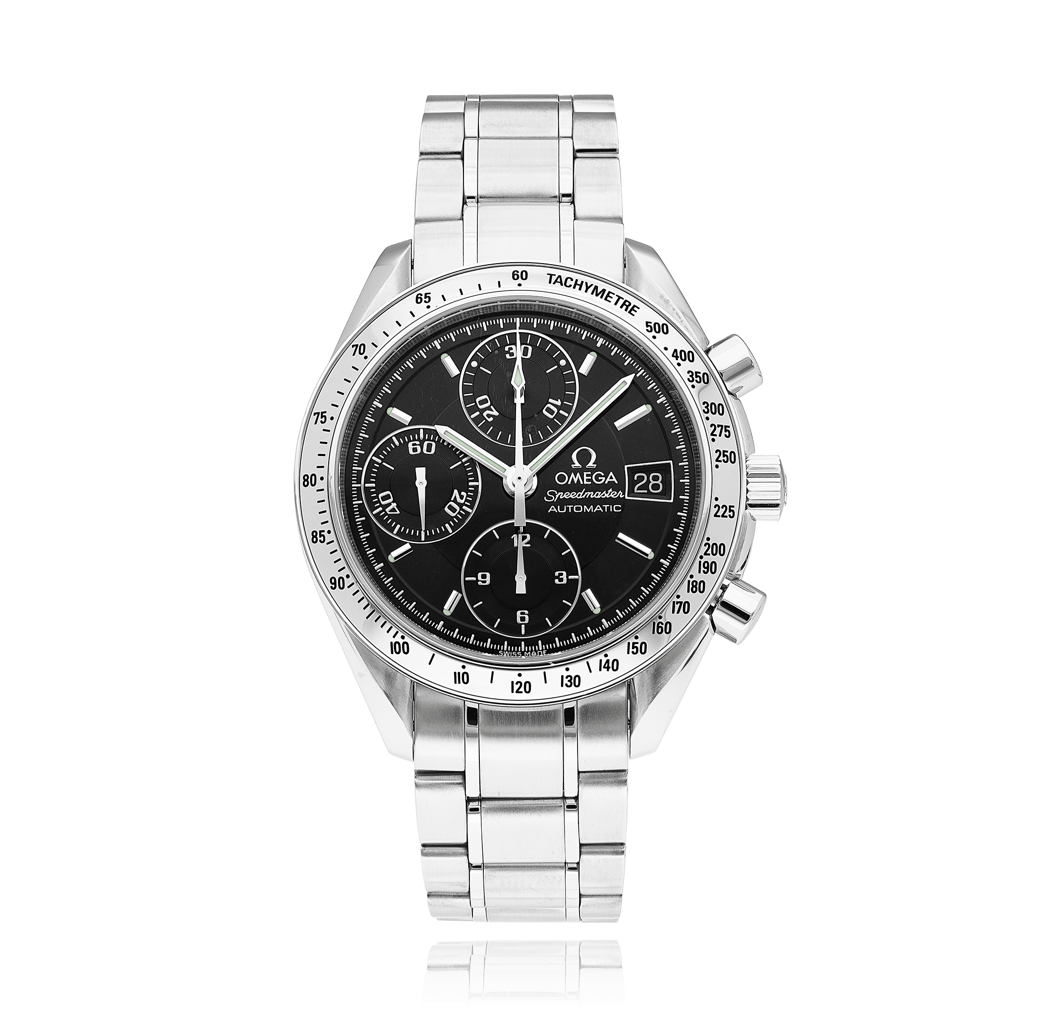 Omega Speedmaster with a 39 mm stainless steel case and a sapphire glass, water resistant; inside is the automatic calibre 1152, chronograph as additional function a black index face with date indication, the bracelet is a steel metal bracelet; accessory: bucherer box.