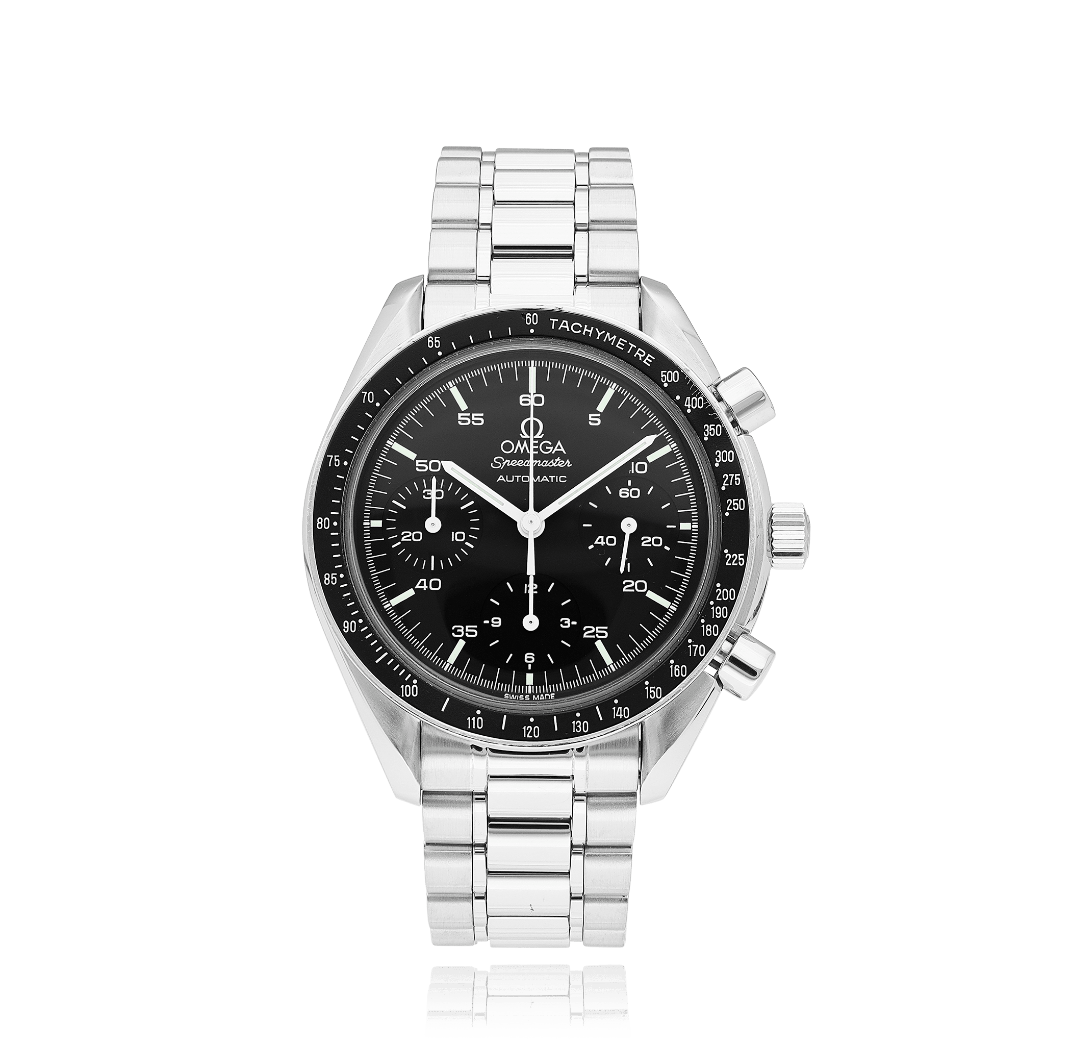 Omega Speedmaster with a 39 mm stainless steel case and a acrylic glass, water resistant; inside is the automatic calibre 3220, chronograph as additional function a black index face without date indication, the bracelet is a steel metal bracelet; accessory: bucherer box.