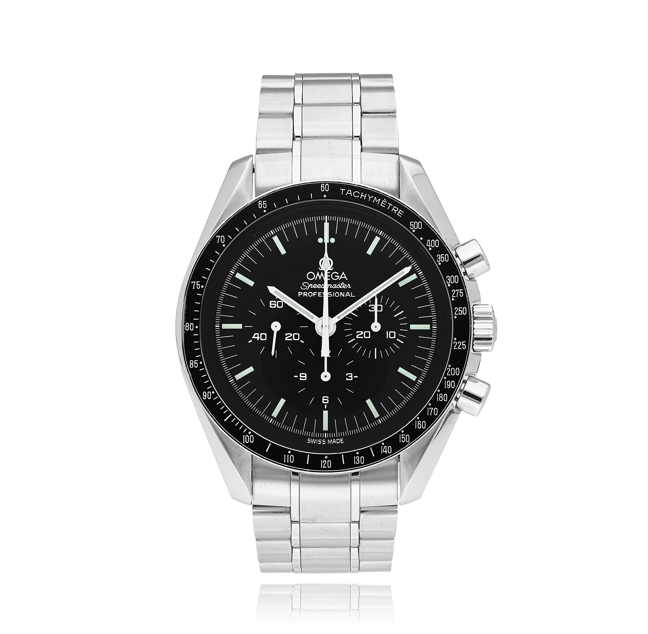 Omega Speedmaster with a 42 mm stainless steel case and a acrylic glass, water resistant; inside is the manual calibre 1861, chronograph as additional function a black index face without date indication, the bracelet is a steel metal bracelet; accessory: bucherer box.