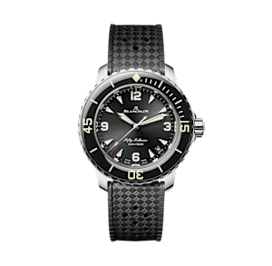 BLANCPAIN wristwatch, Fifty Fathoms 38.2 mm, steel,. rubber strap, with pin buckle, black dial with index, automatic, Cal. 1315, centre seconds, satin finish, sapphire-crystal, 30 atm, Ref.:5007-1130-B64A