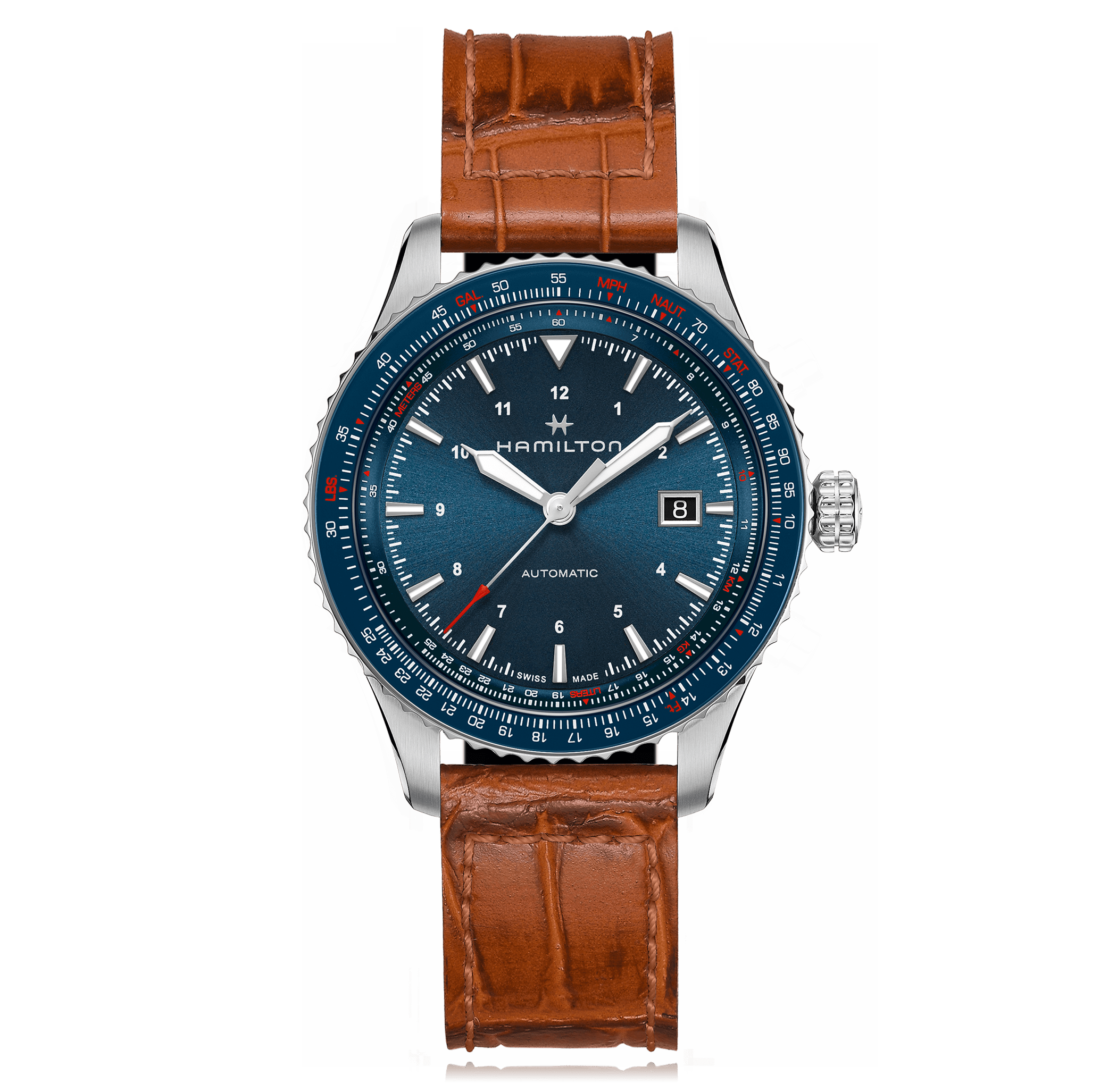 Wristwatch, HAMILTON Khaki Aviation, 42 mm, steel, bracelet calfskin, with pin buckle, blue dial automatic, Cal. H10, centre seconds, sapphire-crystal, 10 atm, Ref.:H76645540