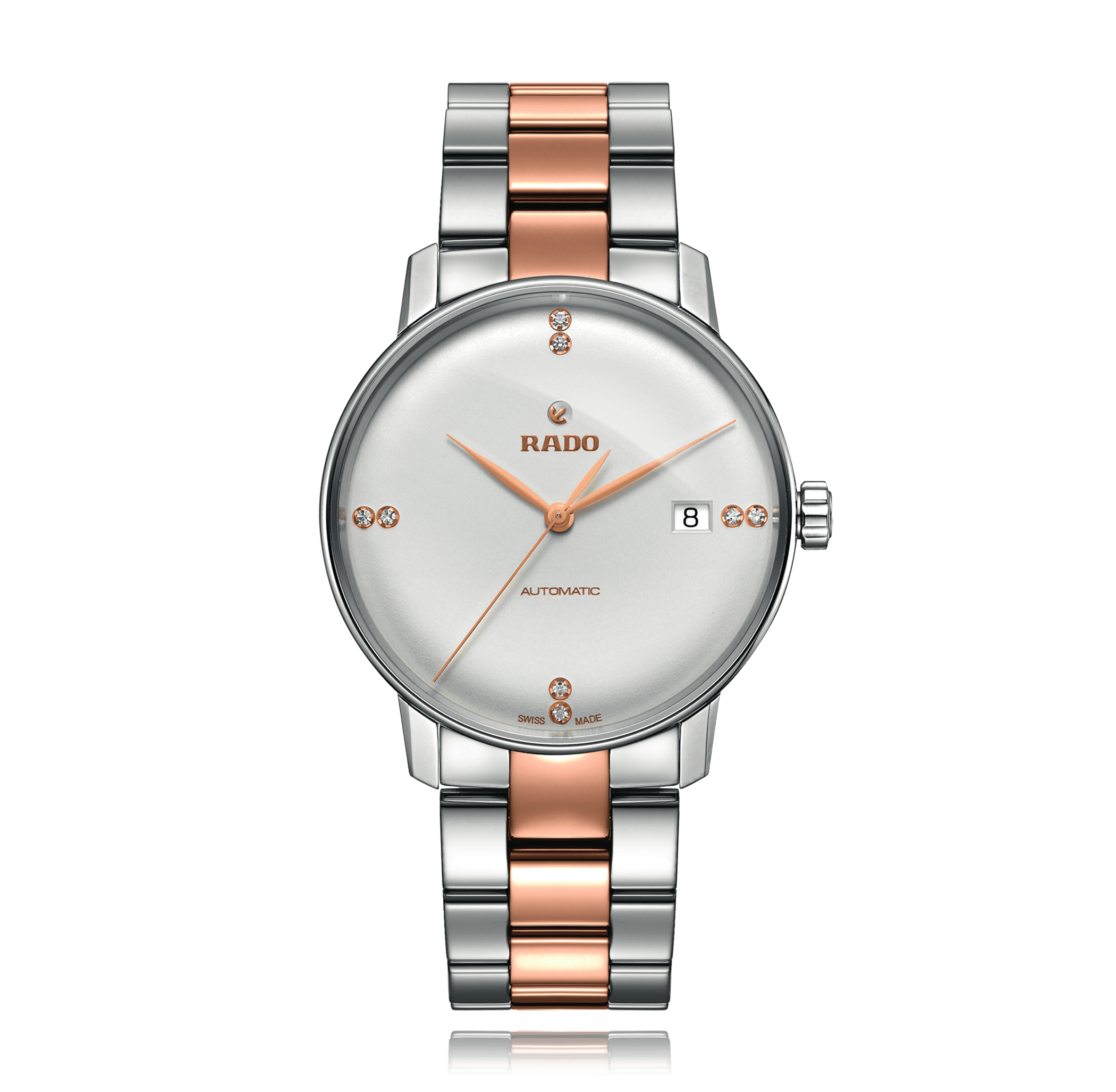 Rado Coupole avec un boîtier de 38 mm en bicolore et un verre saphir, étanche; à l'intérieur se trouve le calibre automatique c07.611, cadran argent diamants, indication: , bracelet bicolore métal; accessoire: écrin (original), garantie de vente (original).