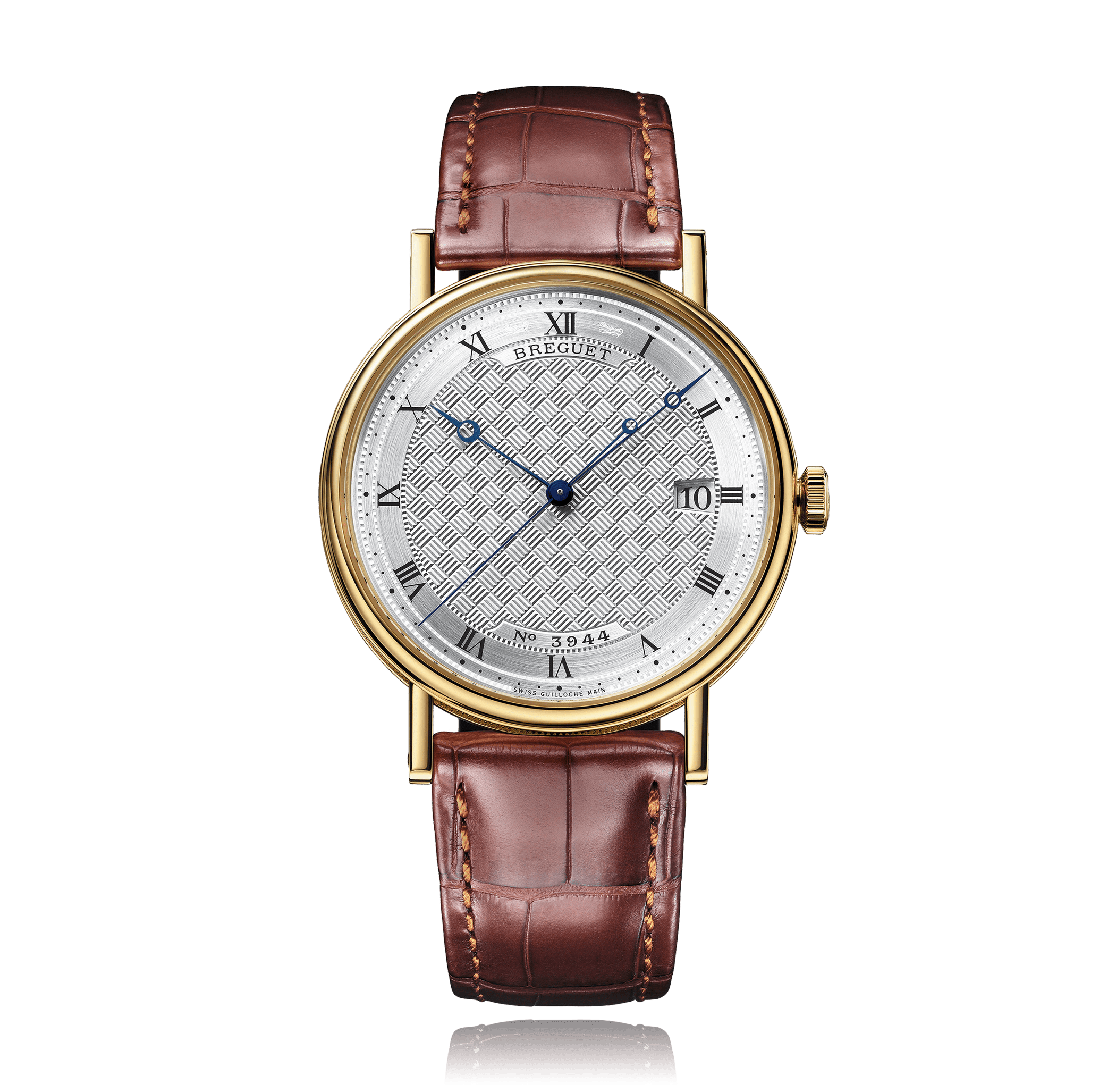 Montre-bracelet BREGUET Classique 38mm, medium, or jaune 18K, bracelet cuir, cadran: argenté avec romains, automatique glace saphir, étanche, Ref.:5177BA/12/9V6
