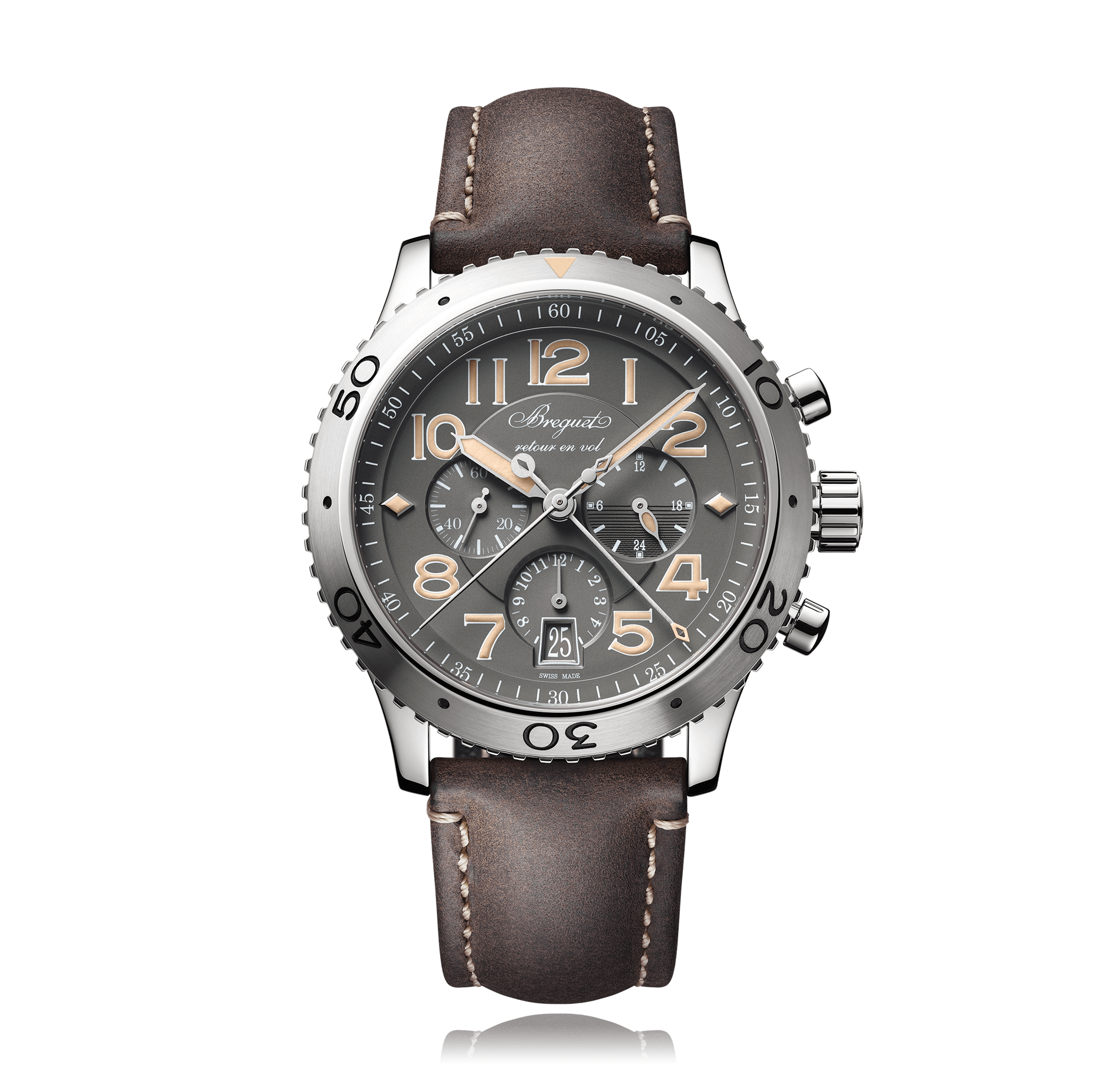 Chronographe Breguet, Type XXl 42mm, acier cuir veau, cadran: gris avec arabes, automatique Calibre 584 Q/2, glace saphir, 10 atm, Ref.:3817ST/X2/3ZU