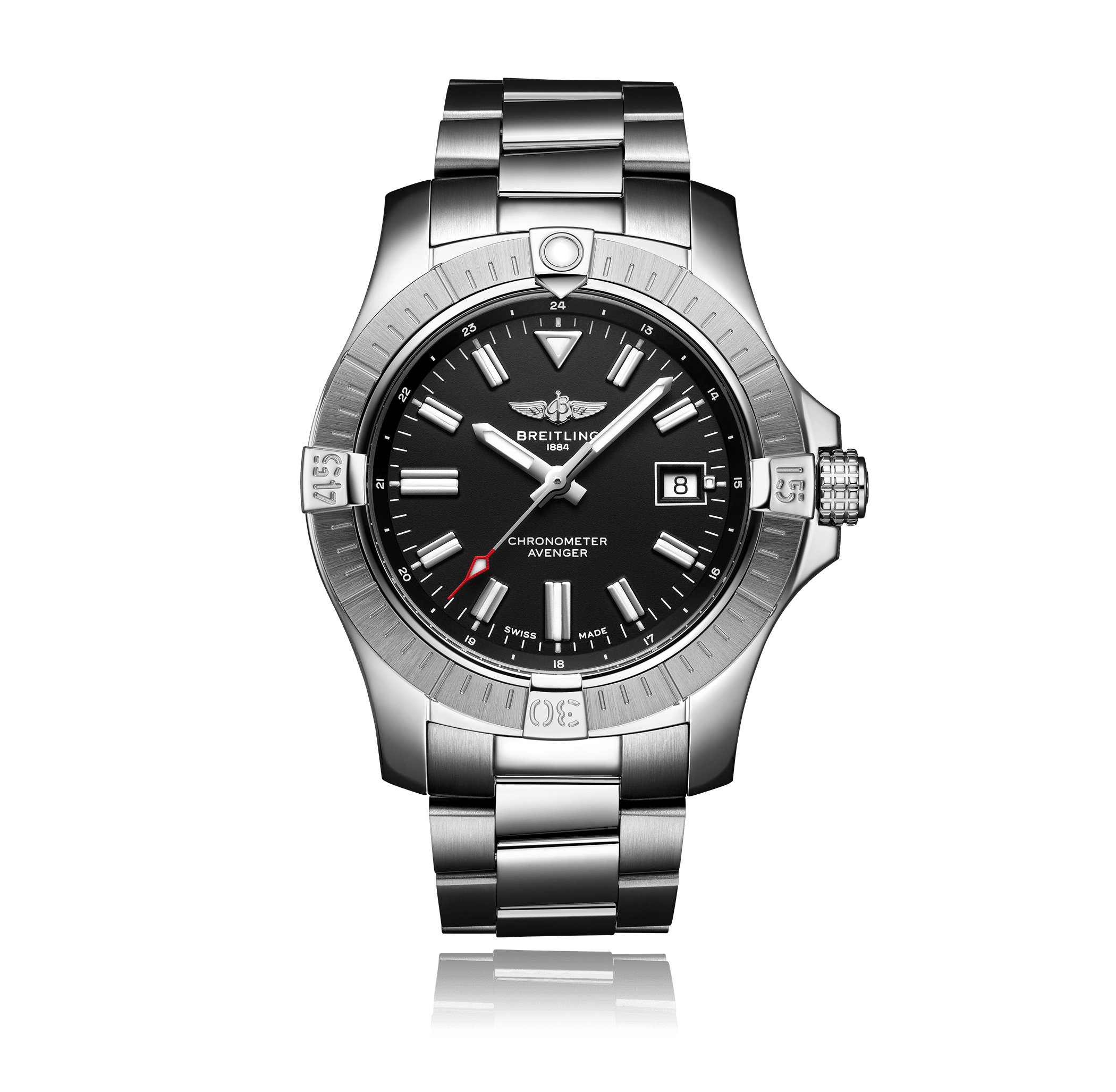 Montre-bracelet, BREITLING Avenger GMT, 43 mm, acier,. bracelet acier, cadran: noir avec index, automatique, Calibre Breitling 32, glace saphir, 30 atm, Ref.:A32397101B1A1
