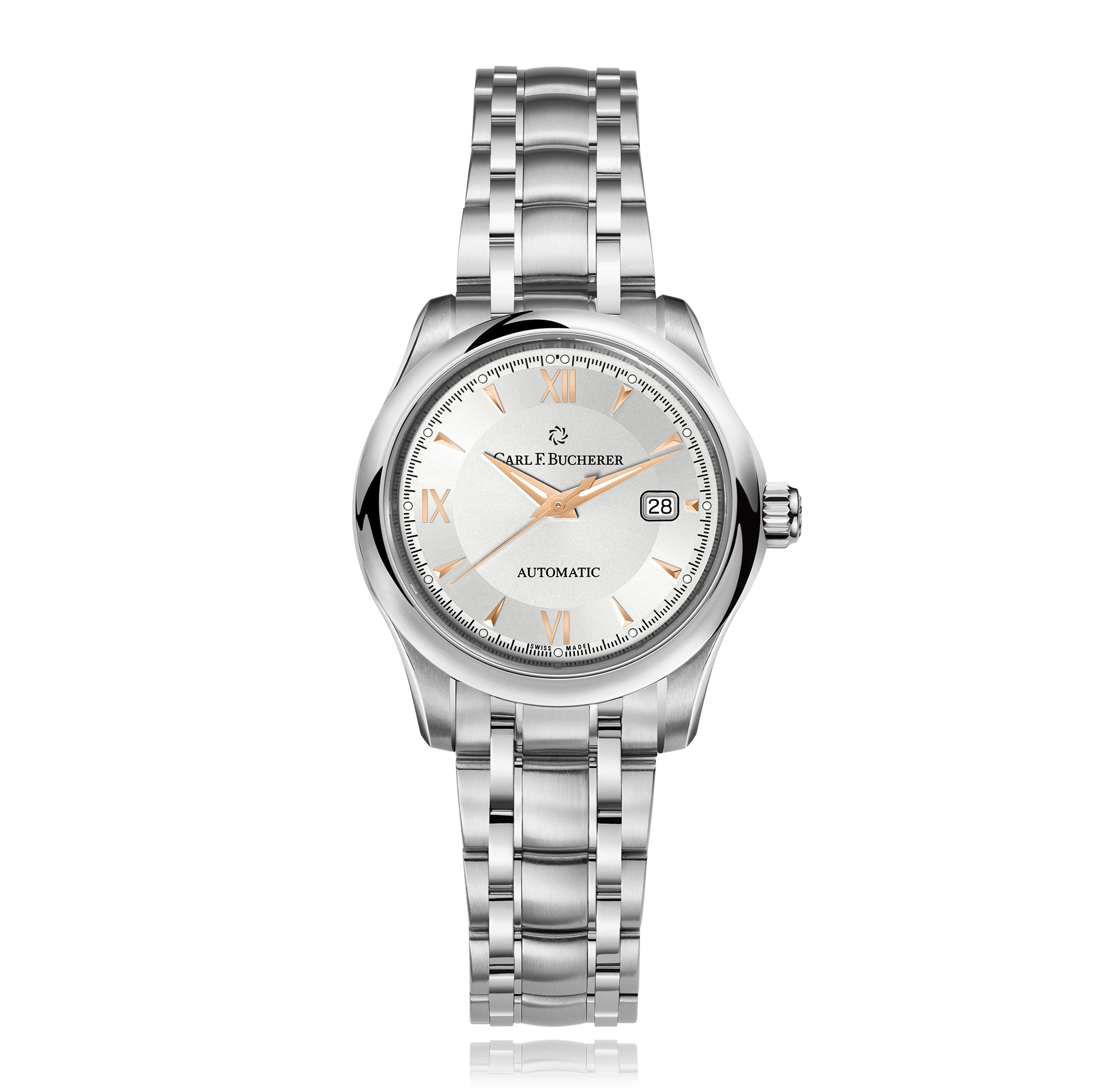 CARL F. BUCHERER Manero AutoDate 30 mm montre-bracelet acier automatique avec date ronde 3 atm cadran: argenté romains / indices, bracelet acier, Ref.:00.10911.08.15.21