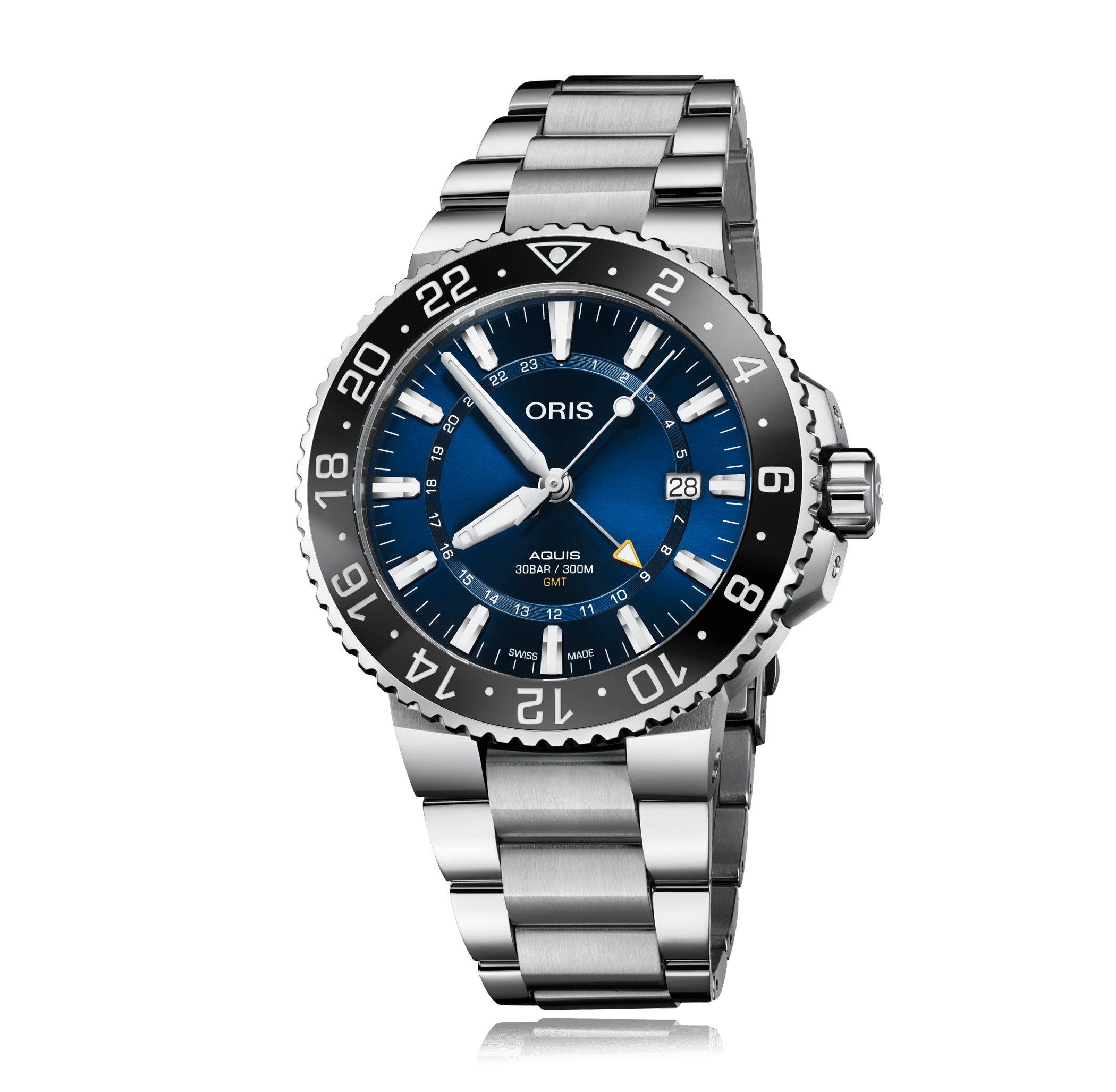 Montre-bracelet ORIS Aquis GMT, 43.5mm, acier bracelet acier, cadran: bleu avec index, automatique Calibre SW 330-1, glace saphir, 30 atm/couronne vissée, avec GMT, Ref.:798.7754.4135-8.24.05PEB