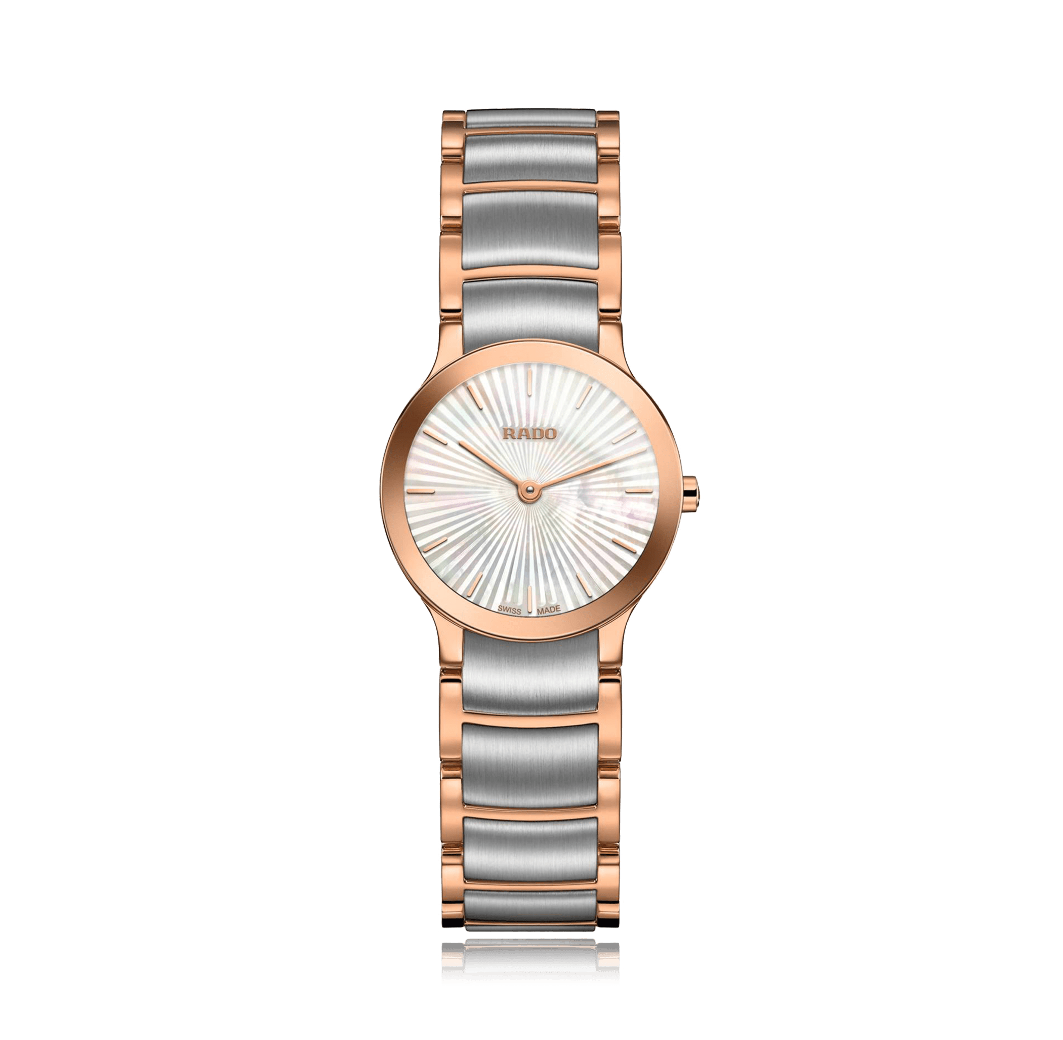 Montre-bracelet RADO Centrix 22.9 mm, small, acier/PVD rose bracelet acier, cadran: nacre avec index, quartz glace saphir, Ref.:R30186923