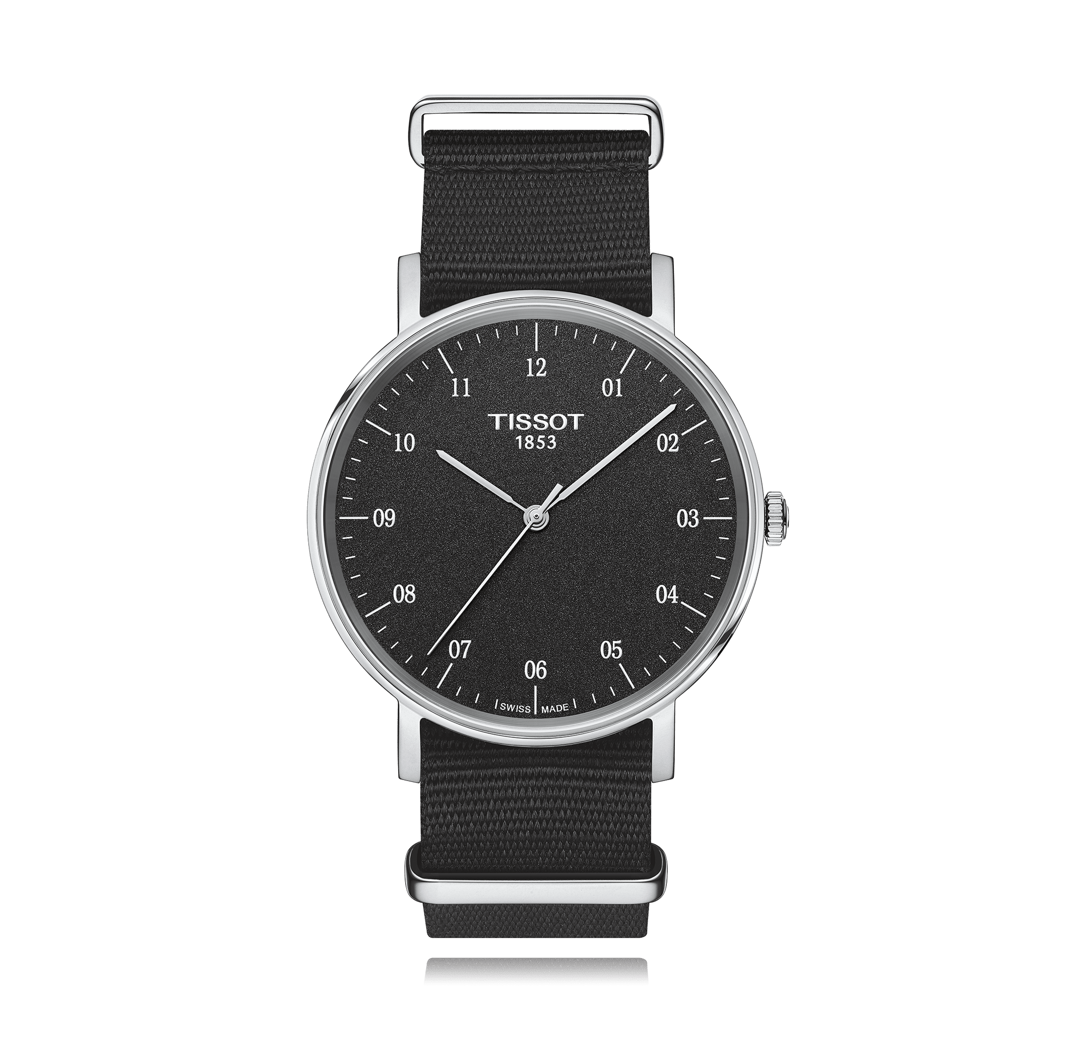Montre-bracelet TISSOT T-Classic Every Time, 38mm, acier bracelet en textile, cadran: noir avec arabes / indices, quartz Calibre ETA 902.101, glace saphir, 3 atm, avec eol, Ref.:T109.410.17.077.00