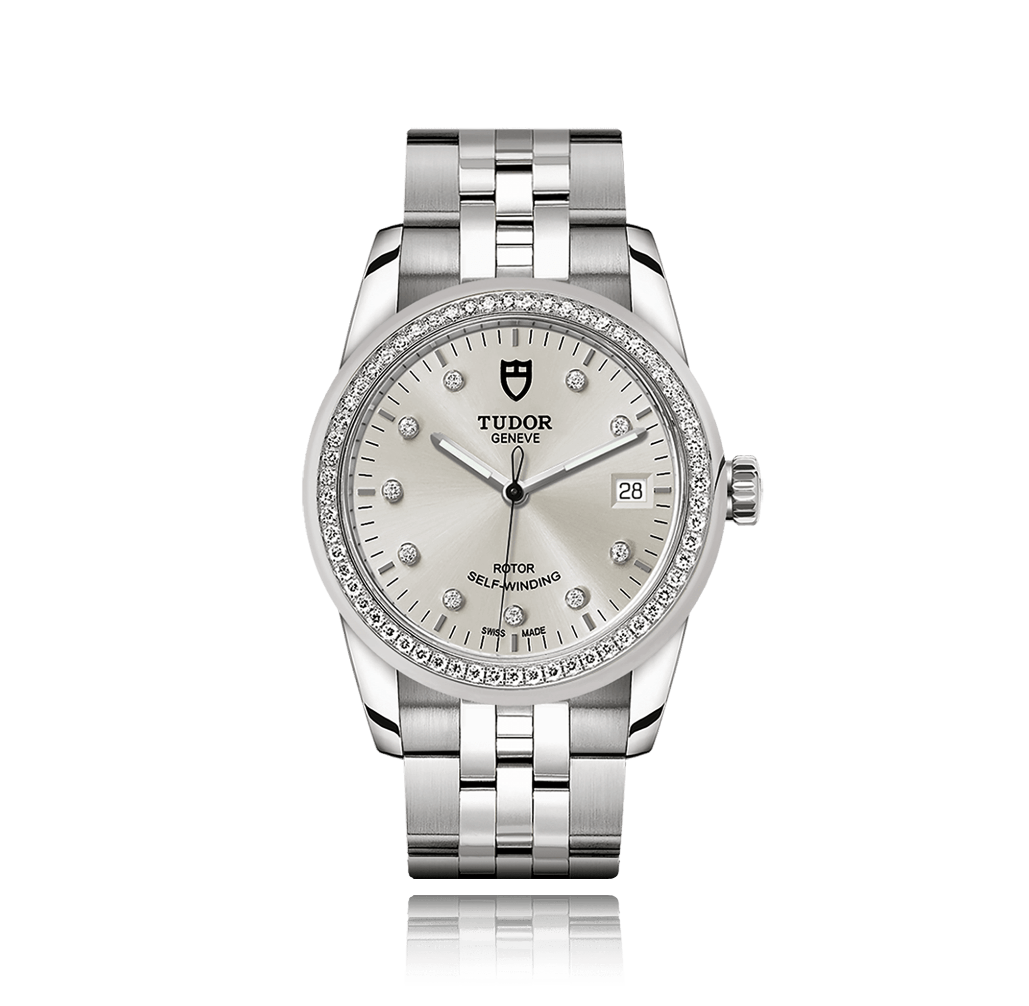 Montre-bracelet TUDOR Glamour Date 36 mm, 36mm, acier bracelet acier, cadran: argenté avec 10 diamants, automatique Calibre 2824, glace saphir, étanche, 60 brillants, total: 0.63 ct. Ref.:55020-68050