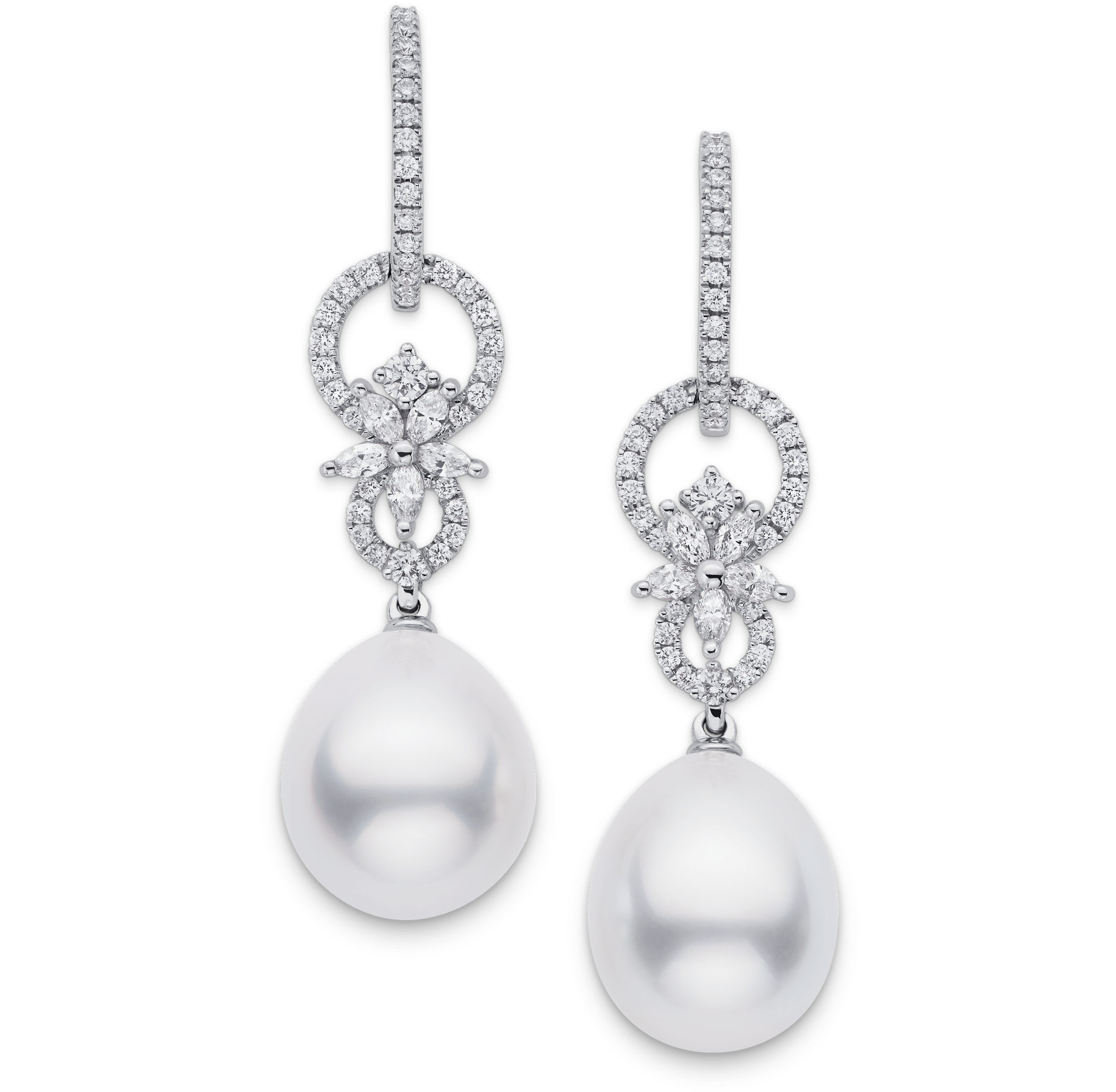 When softly shimmering pearls and precious shining white gold are worked to create earrings, beautiful specimens like these are the result. They are secured with a latch fastener. The beautifully designed hanger is decorated with 2 South Sea cultured pearls 10 mm – 11 mm in size and brilliant-cut diamonds (0.85 carat in total) to create a sparkling shine.