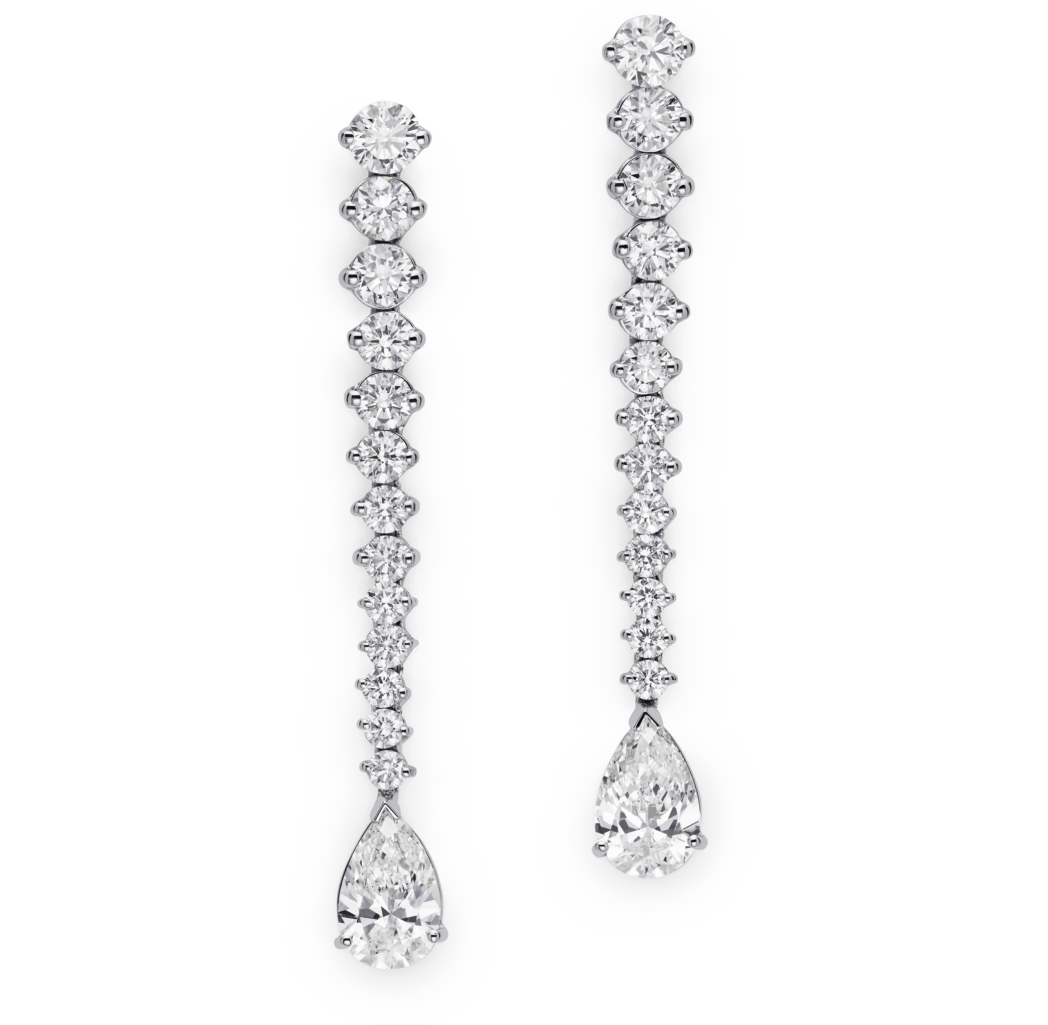 Ear pins Soirée pendant 18K white gold, 2 diamonds with pear cut total 2.03 ct., diamond with brilliant cut total 2.52 ct.