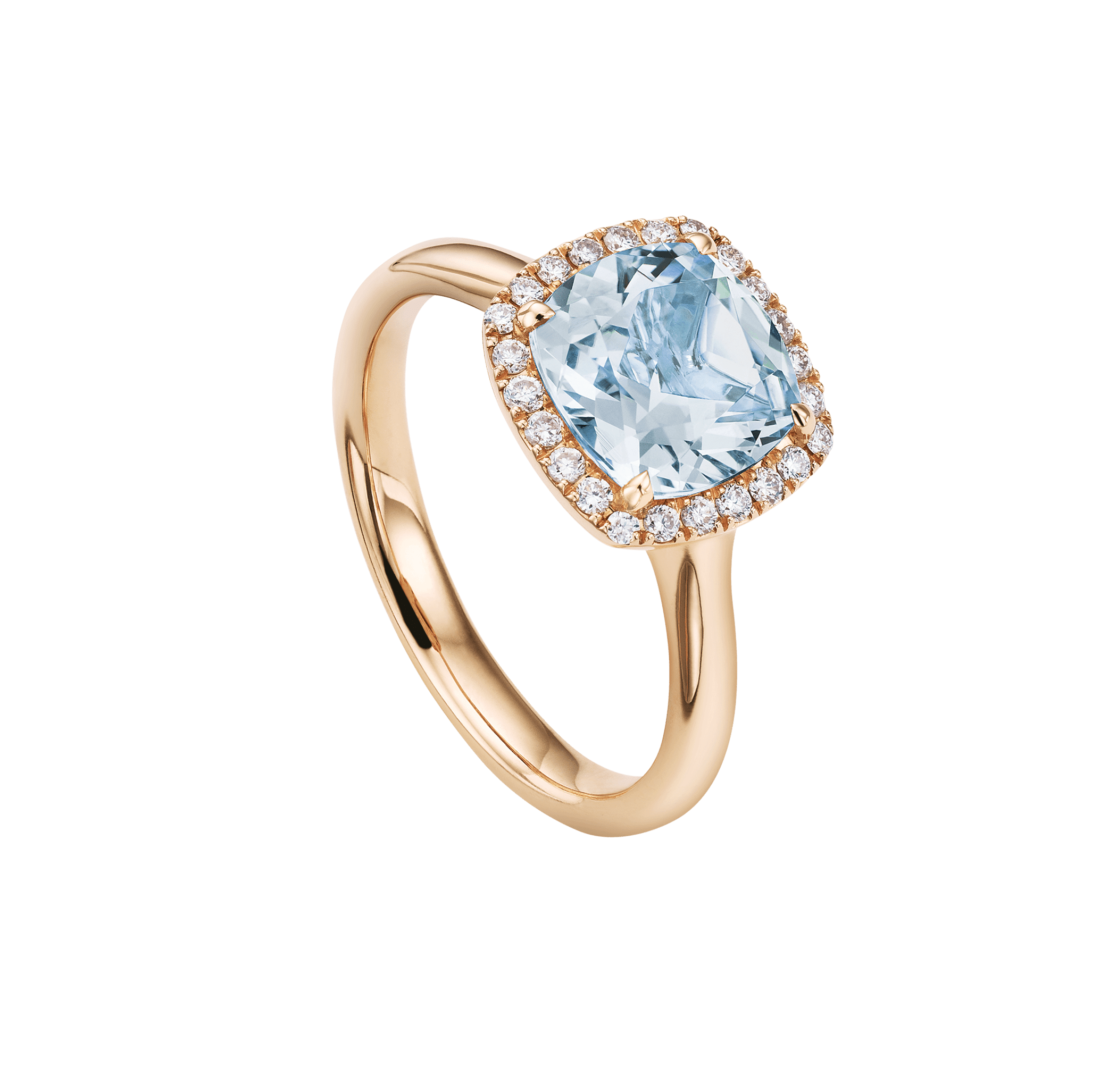 A symbol of love, a token of faith or a great accessory for a casual outfit? The entourage ring in 18K rose gold, with its faceted aquamarine (1.38 carat in total) can be many things. It is topped off with 24 brilliant-cut diamonds (0.17 carat in total), making it even more striking and sparkling. Please be aware that this is the only ring size that is available online. For other sizes or to make an appointment, please contact our customer service.