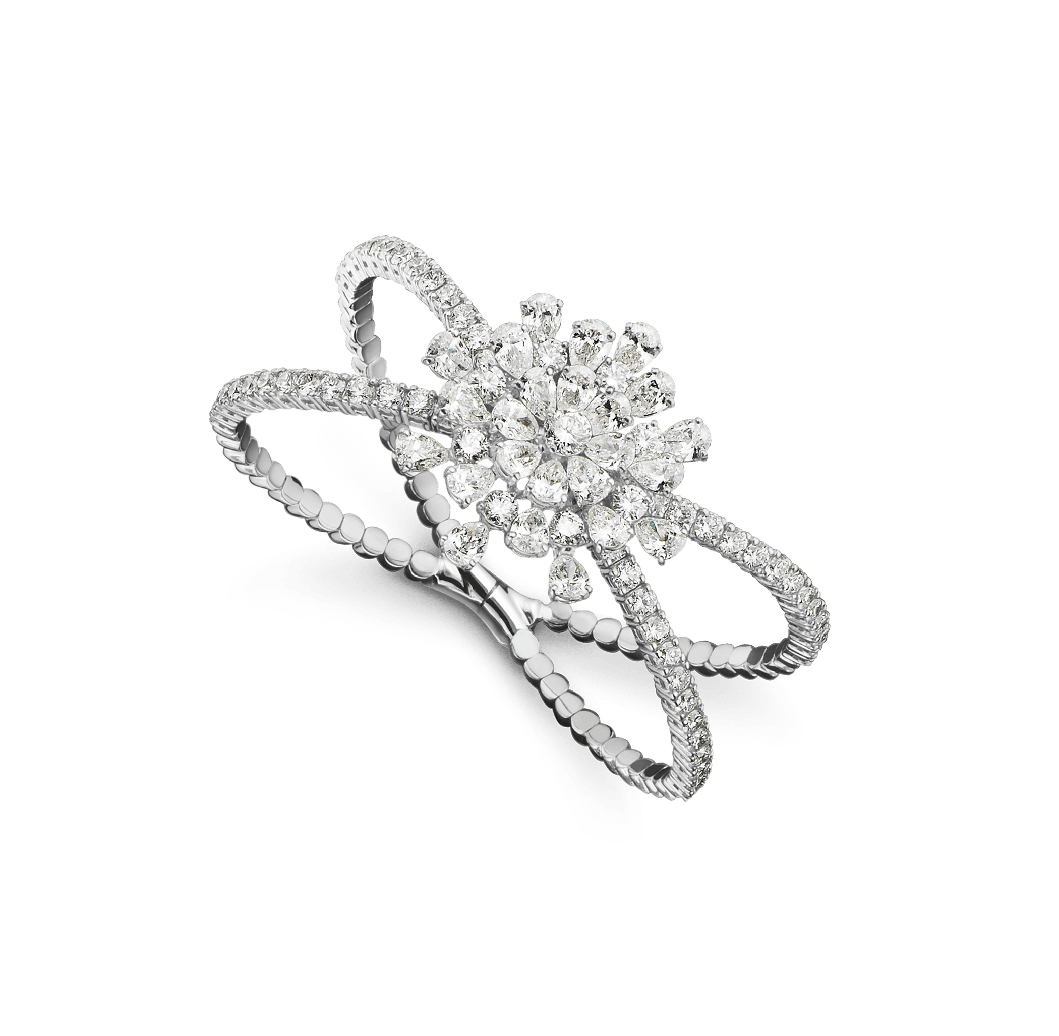 For fairytale moments and sparkling eyes. The bangle is made from subtly shimmering 18 carat white gold, and has an especially striking shape. The criss-crossing bands are set with 65 brilliant-cut diamonds (6.77 carat in total). 24 pear-cut diamonds (7.50 carat in total) form a sparkling flower, creating the crowning glory of the piece. This piece of jewellery cannot be bought online. Please contact our customer service to arrange an appointment. We will be pleased to supply the desired piece of jewellery to your nearest Bucherer store.