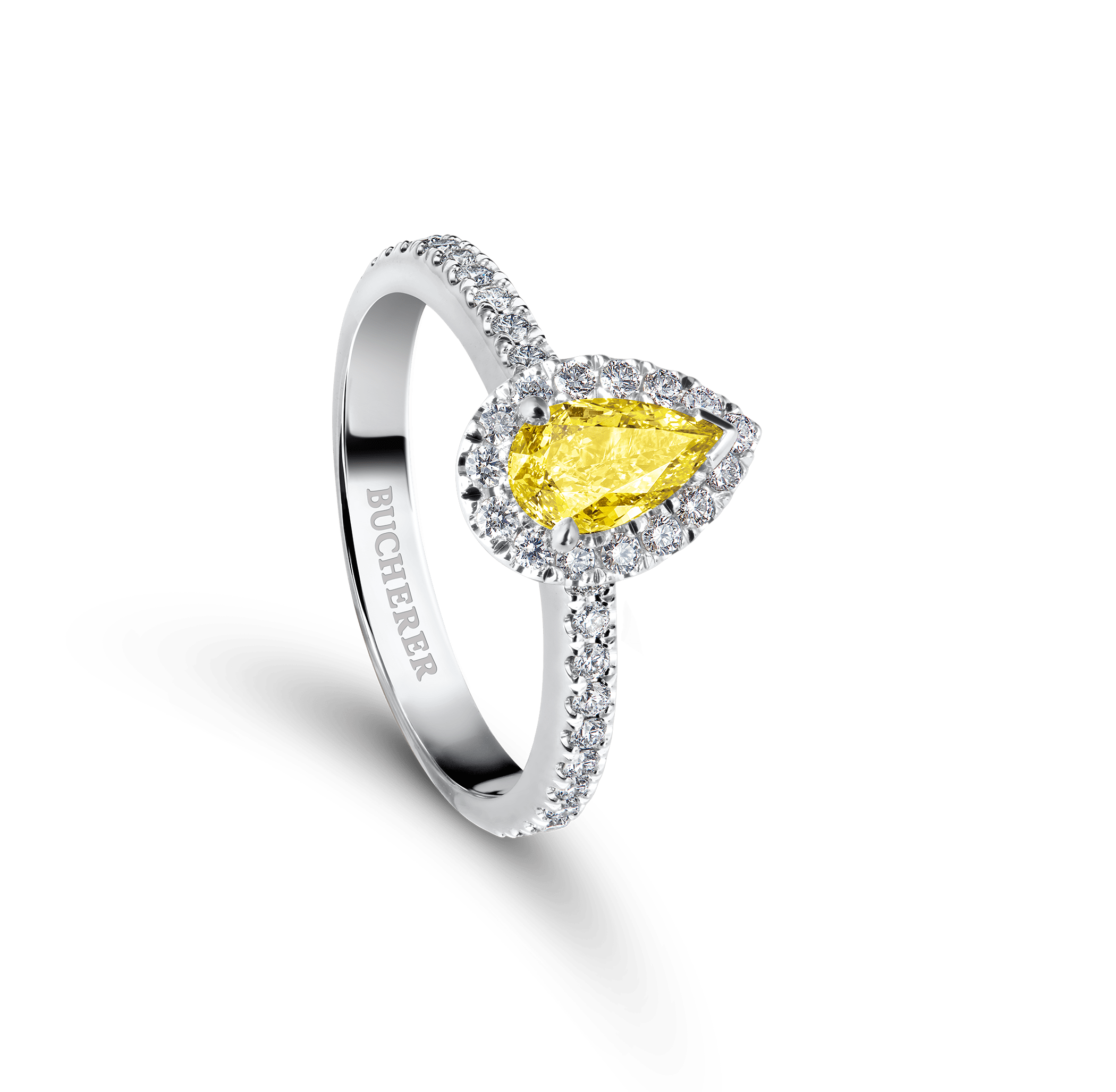Mounted solitaire Joy surround platinum size 53, diamond with pear cut total 0.51 ct. fancy intense yell,39 diamonds with brilliant cut total 0.35 ct.