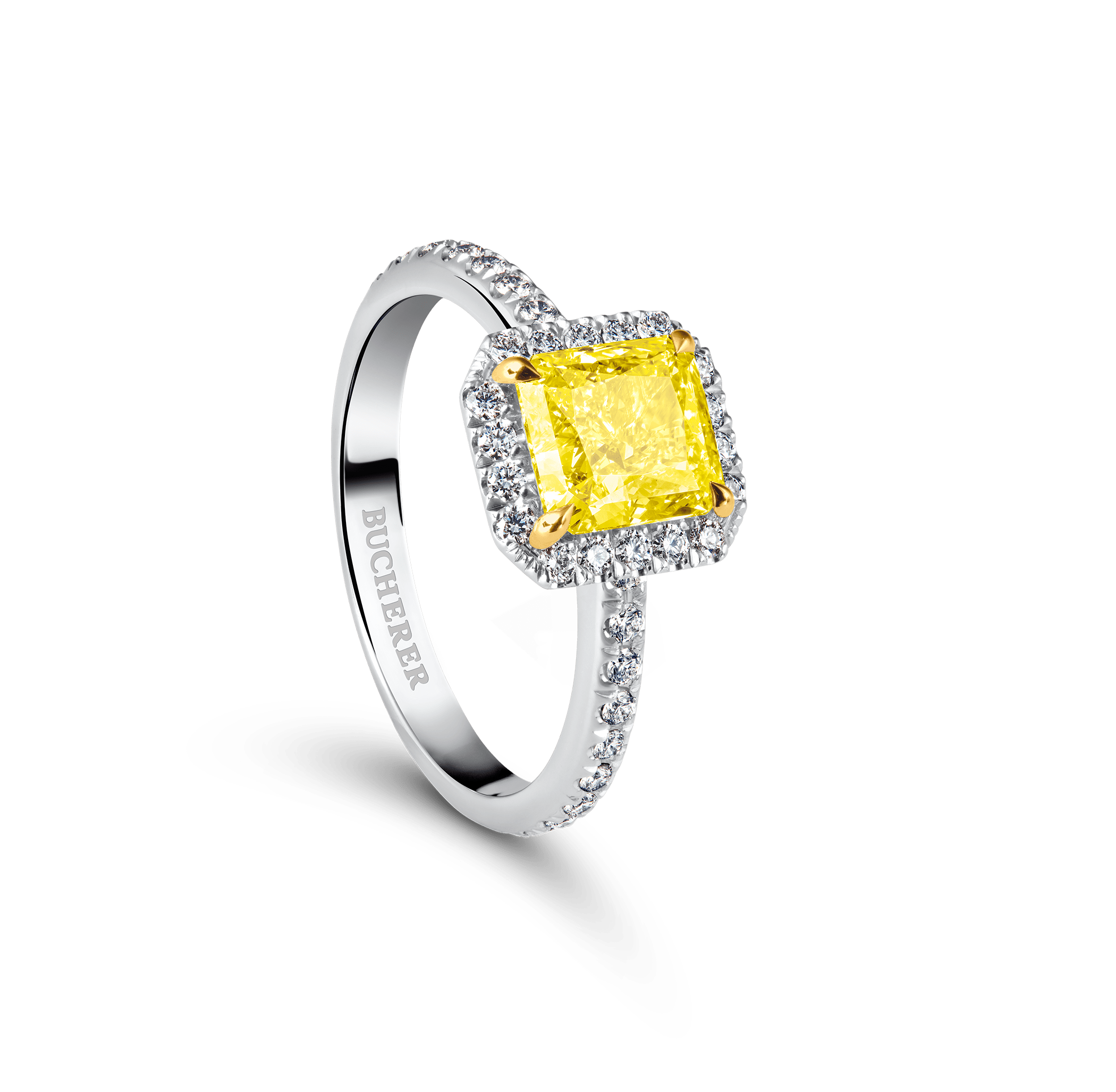 Mounted solitaire Joy surround 18K platinum/yellow gold size 53, diamond with radiant total 1.61 ct. fancy intense yell, 42 diamonds with brilliant cut total 0.39 ct.
