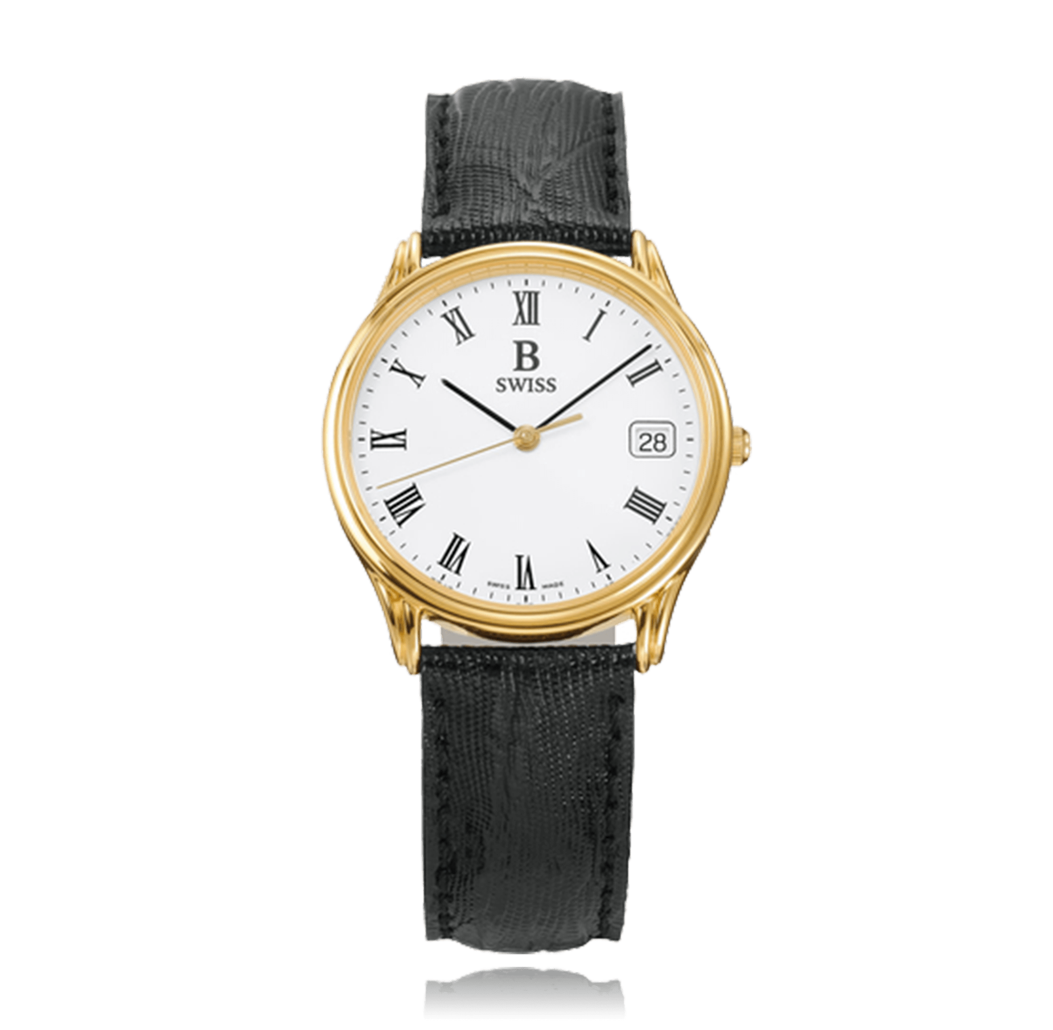 B SWISS CLASSIC gent's wristwatch, PVD quartz end of life indicator with date water-resistant cadran: white romains, leather strap glass sapphire, Case No. 00.50001.10.21.01