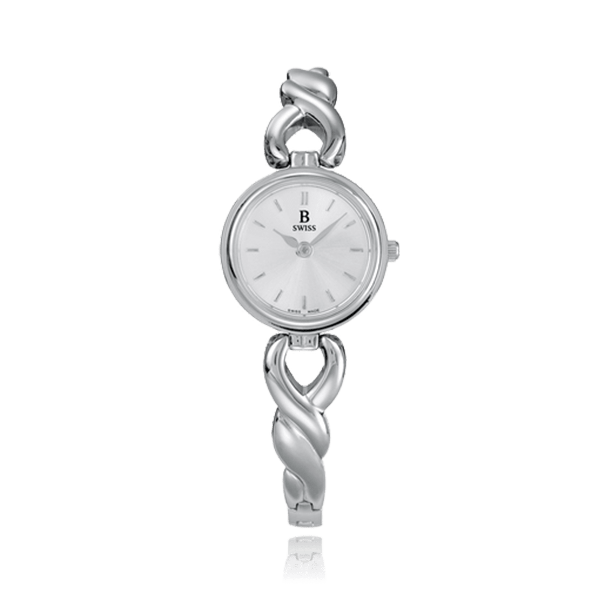 B SWISS DRESS lady's wristwatch, steel quartz round water-resistant cadran: silver index, steel bracelet glass mineral, Case No. 00.90004.08.13.21