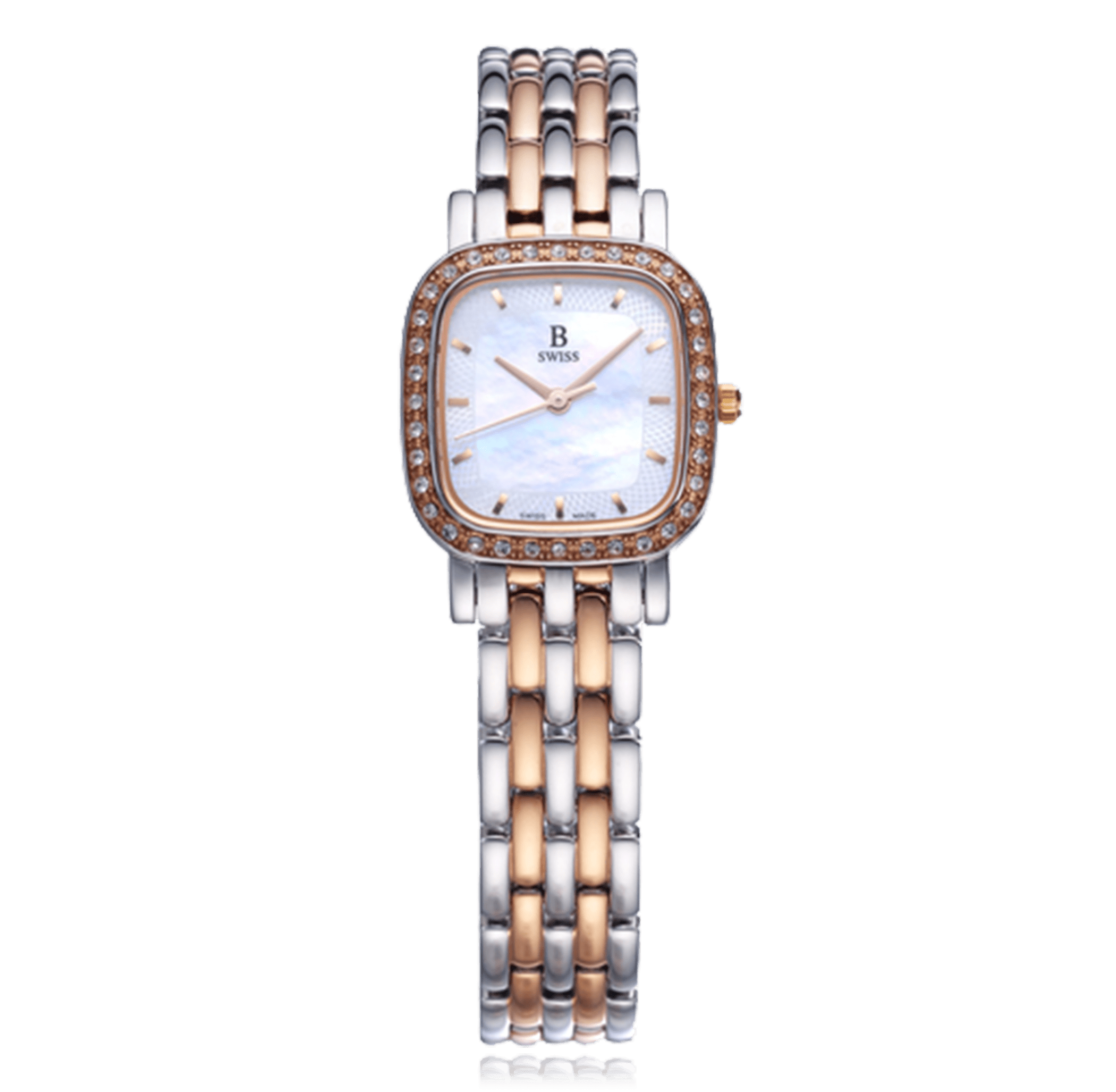 B SWISS Dress lady's wristwatch, Stahl/PVD bico quartz rectangular water-resistant cadran: white mother of pearl index, steel/PVD bracelet glass sapphire 36 zircon, Case No. 00.90012.35.73.31