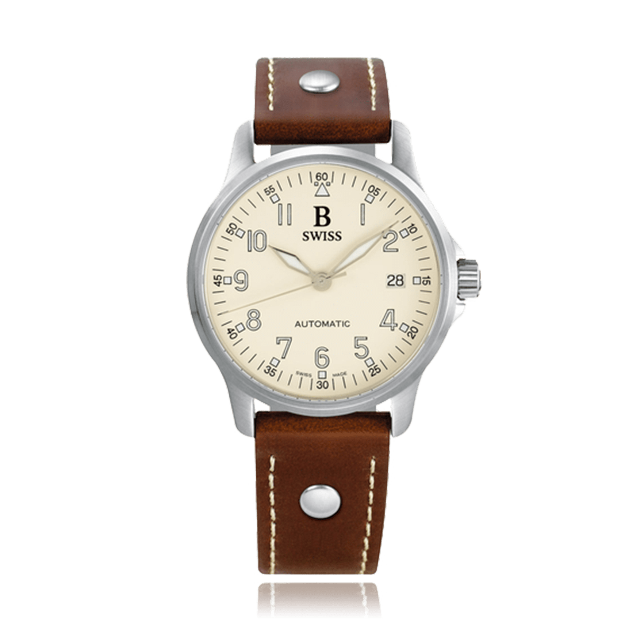 B SWISS FLIGHTSTAR gent's wristwatch, steel automatic with date water-resistant cadran: white arabes, leather strap glass sapphire, Case No. 00.50601.08.22.01