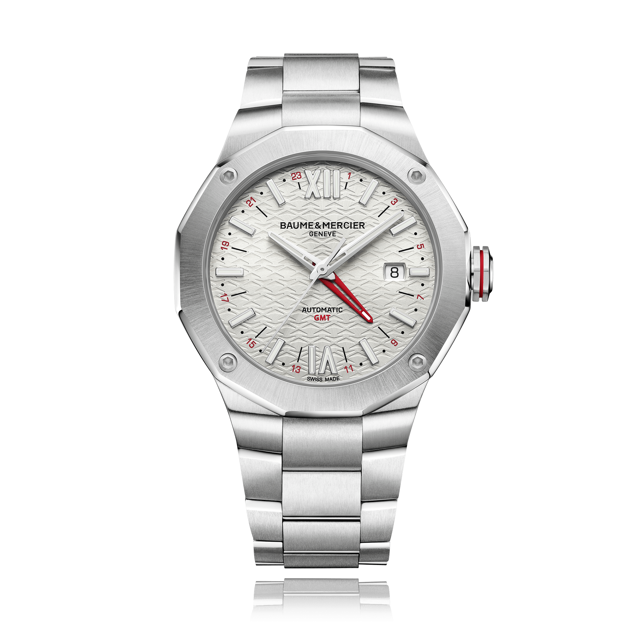 Wristwatch, BAUME & MERCIER Riviera 42 mm, steel,. steel bracelet, with folding clasp, silver dial with röm./Index, automatic, centre seconds, sapphire-crystal, 10 atm, with GMT, Ref.:M0A10658