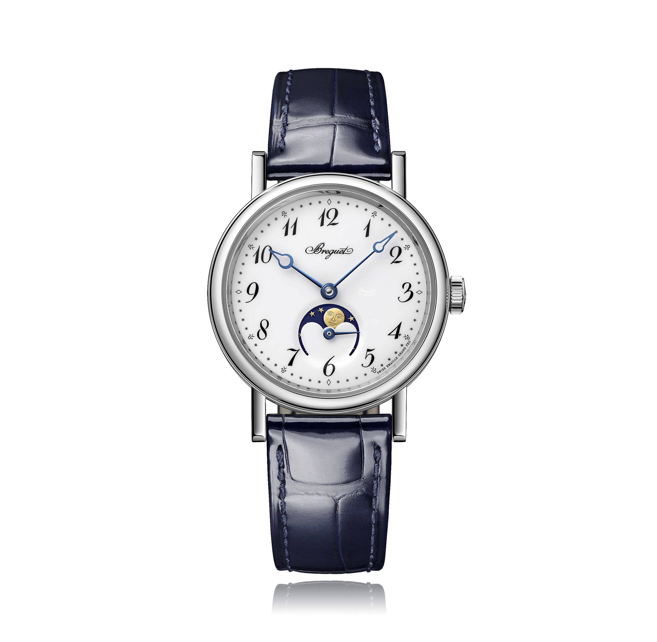 Wristwatch BREGUET Classique Phases de lune, 30mm, 18K white gold, Alligator strap, with pin buckle, white/enamel dial with arabic, automatic Cal. 537 L, sapphire-crystal, with with moon-phase indicator, Ref.:9087BB/29/964