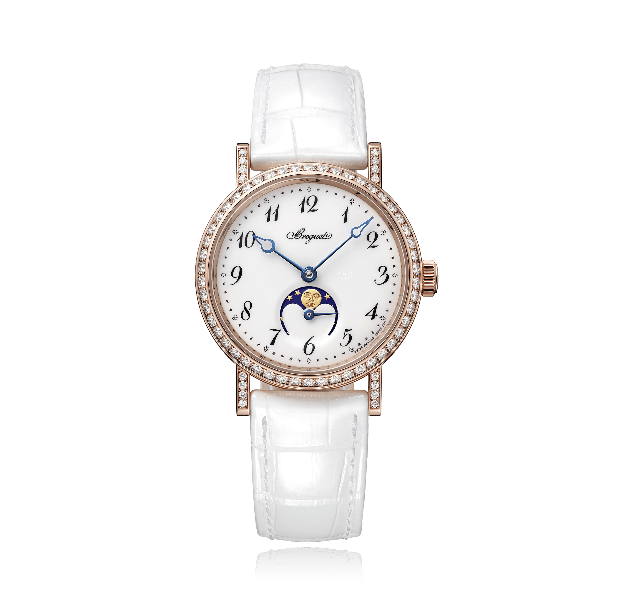 Wristwatch BREGUET Classique Phases de lune, 30mm, 18K red gold, Alligator strap, with pin buckle, white/enamel dial with arabic, automatic Cal. 537 L, sapphire-crystal, with with moon-phase indicator, 66 diamonds, total: 1,04 ct. Ref.:9088BR/29/964DD0D