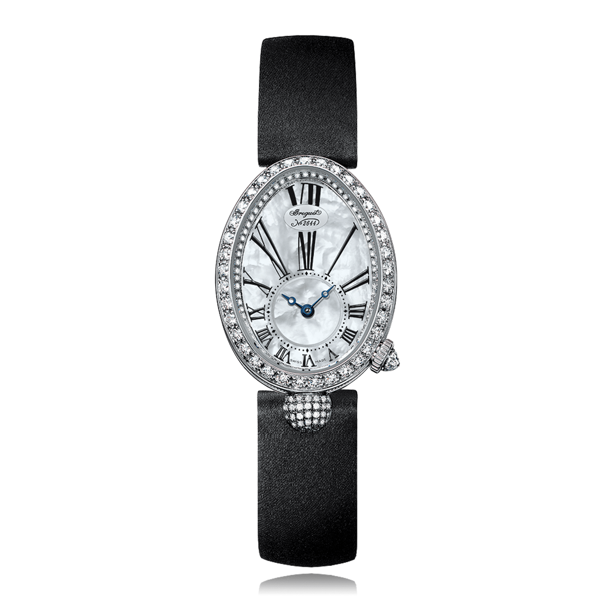 Wristwatch BREGUET Reine De Naples 18K white gold, Satinband, with folding clasp, mother of pearl dial with romains, automatic sapphire-crystal, 139 diamonds, total: 1,32 ct. Ref.:8928BB/51/844DD0D